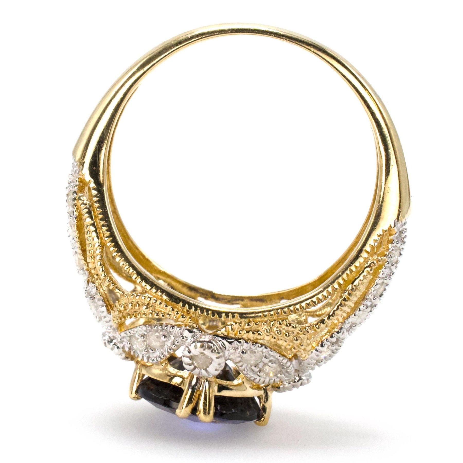 This sweet ring holds a central round checkerboard cut iolite that weighs approximately 1.50 carats. It's set in a two-tone white and yellow gold setting that's embellished with filigree and approximately 0.28 carats of diamonds. This would make an excellent wallet friendly engagement ring.