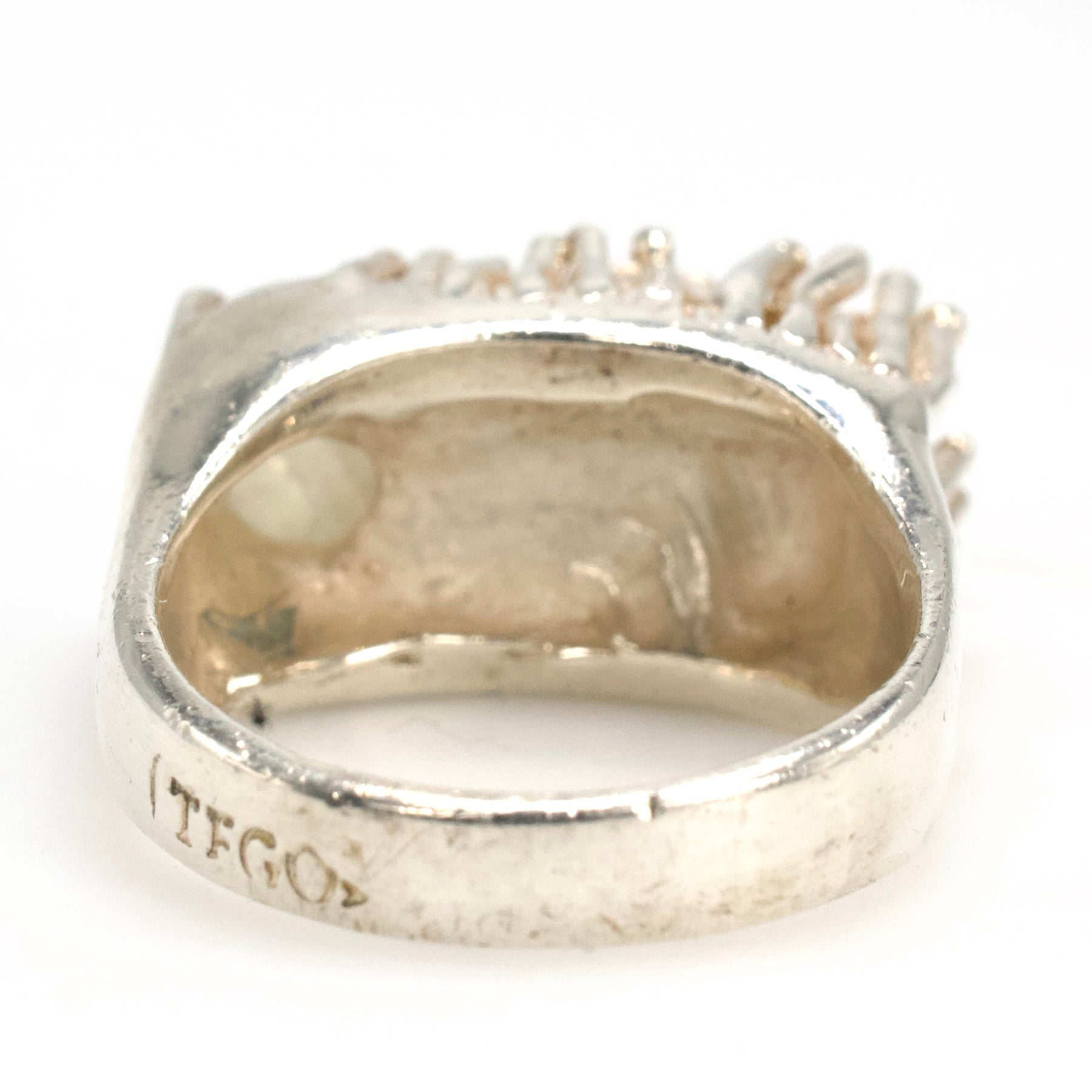 Made in Taxco, Mexico by TeGo (T. Gonzalez), this well designed and beautifully made statement ring almost evokes the image of a pearl nestled amidst coral. In reality, a round cabochon moonstone—with strong adularescence—is engulfed by a collection of sterling silver "rods" that seem to organically grow out of the band. With a 9 mm lift off the finger, this ring feels like silk on the hand and is a surprisingly easy wear.