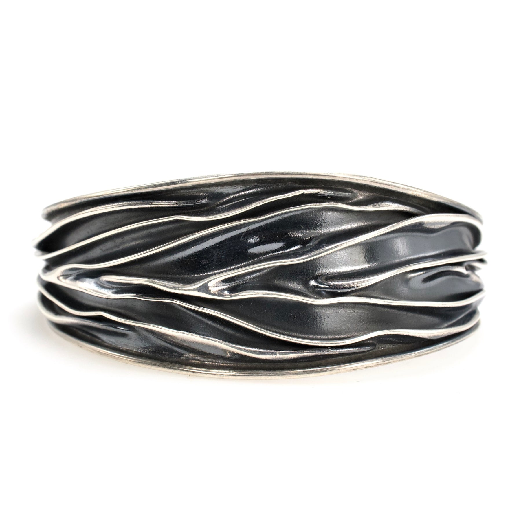 This striking cuff was made in Taxco, Mexico entirely of sterling silver. With polished silver veins atop a dark, oxidized background, it's evocative of leaves, mountains, rivers—take your pick! Either way, it screams "naaaaturrrrre!"