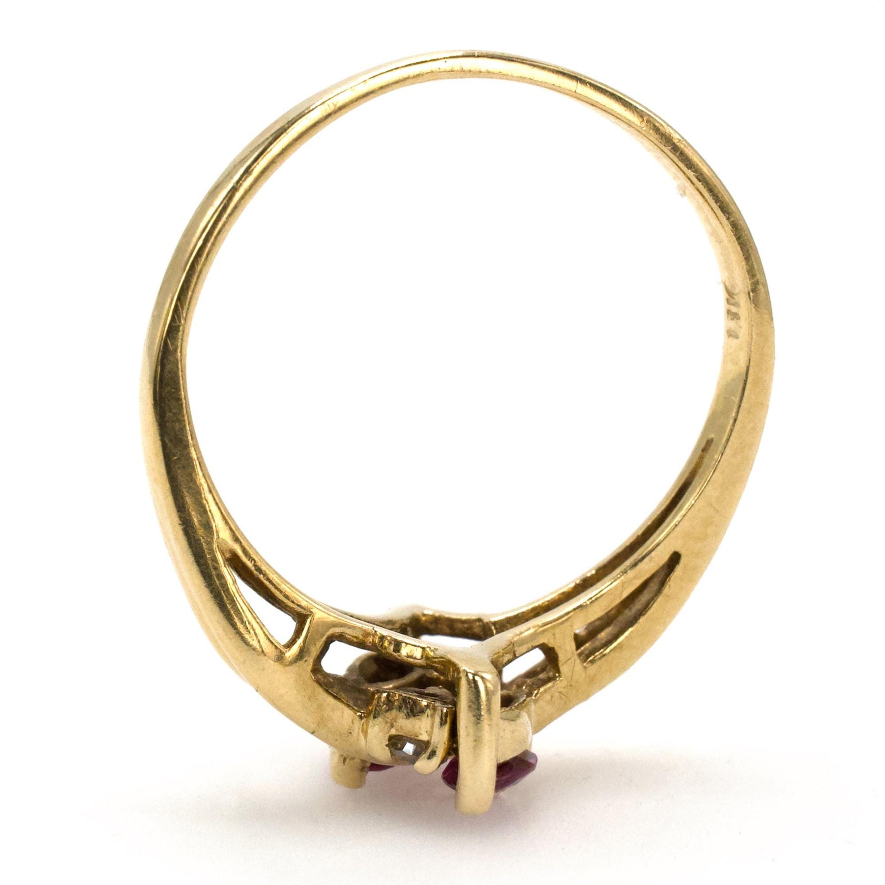 This dainty ring holds two diagonally set marquise cut natural purplish red rubies in yellow gold that are accented by a pair of tiny diamonds. Reminiscent of a bypass ring, the ring has a gentle swirling motion that makes it visually very engaging.