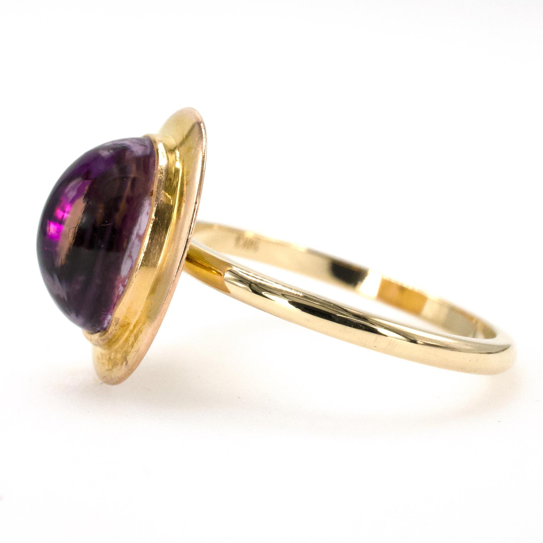 The top of this ring used to be the decorative part of a Victorian stickpin! We removed it from its pin and converted it to a more wearable ring. The bezel is made of 10 karat yellow gold and holds a large cabochon cut purple amethyst—the band is new and made of 14 karat yellow gold.
