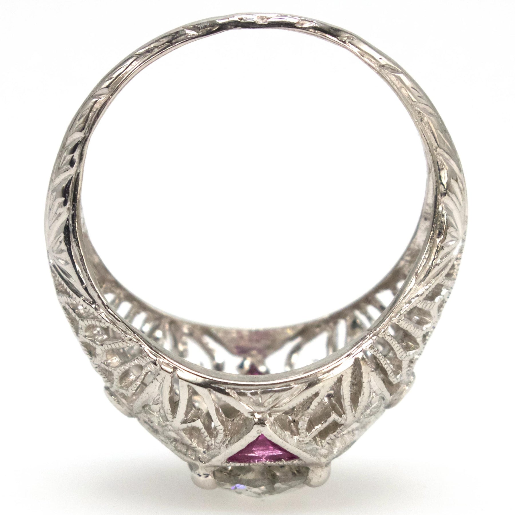This absolutely beautiful Art Deco mounting is, interestingly enough, paired with a diamond that only a mother could love. Made of platinum, the setting has the dramatic lacy metalwork that the Art Deco era is known for. Peppered with six round diamonds, at each side of the diamond is a bezel set brilliant cut triangular ruby, giving a pop of romantic color.