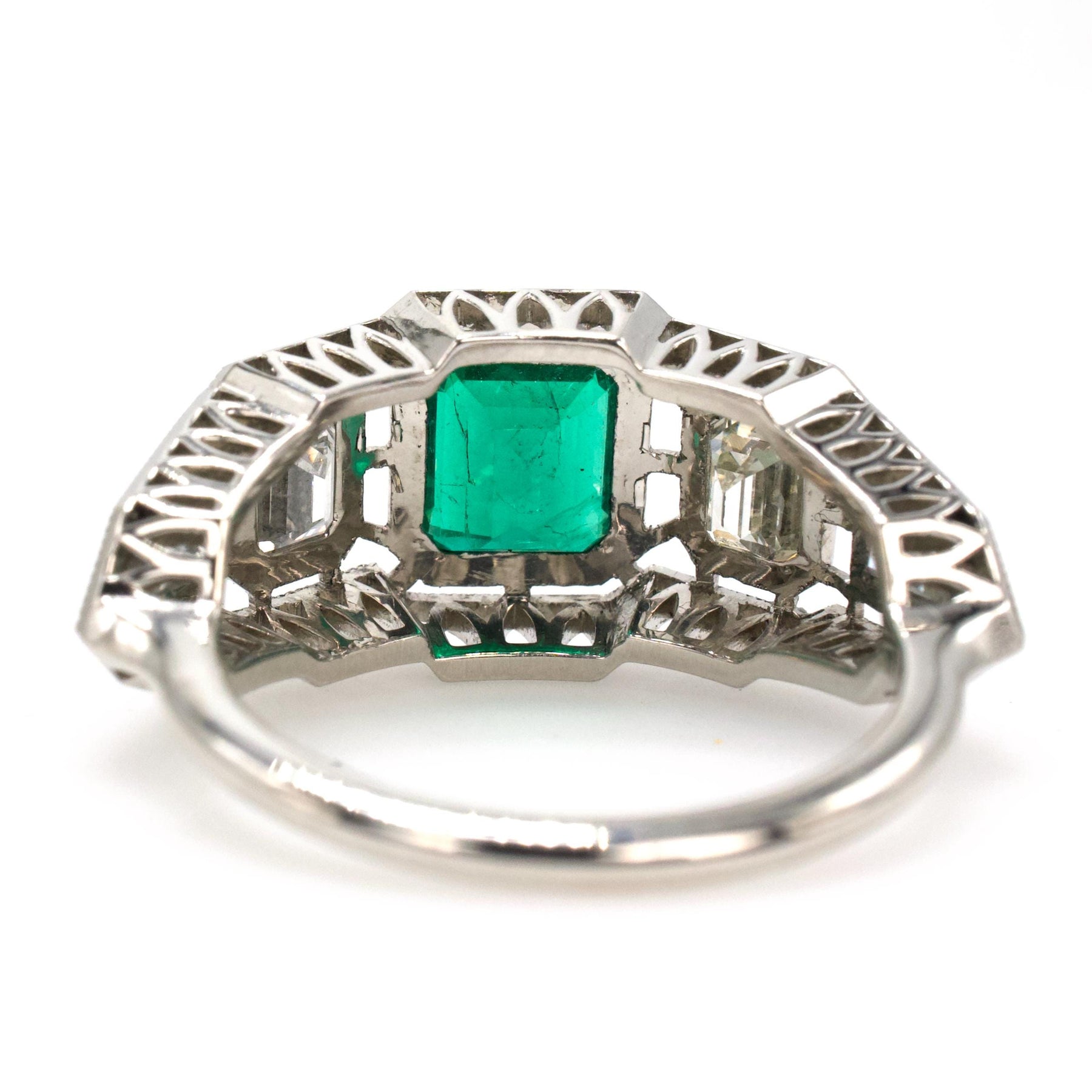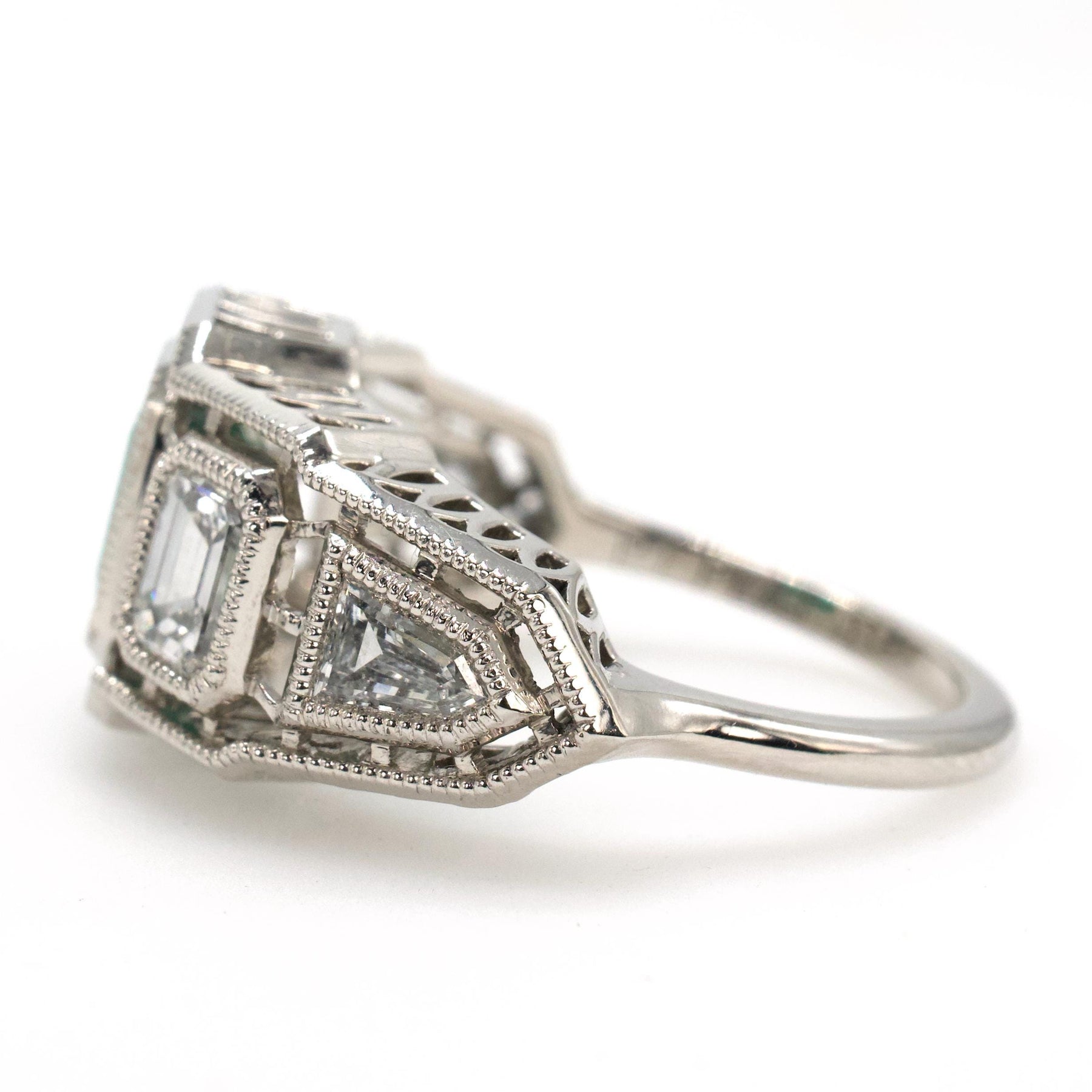 Platinum Art Deco Inspired GIA® Emerald and Diamond Ring with Bullet and Emerald Cut Diamonds