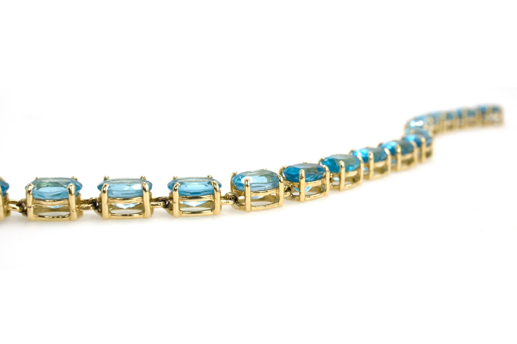 This 14 karat yellow gold bracelet holds 20 absolutely lovely oval cut sky blue topazes. Each stone is horizontally set in a simple four prong basket mounting and the bracelet closes with a hidden clasp and safety latch.