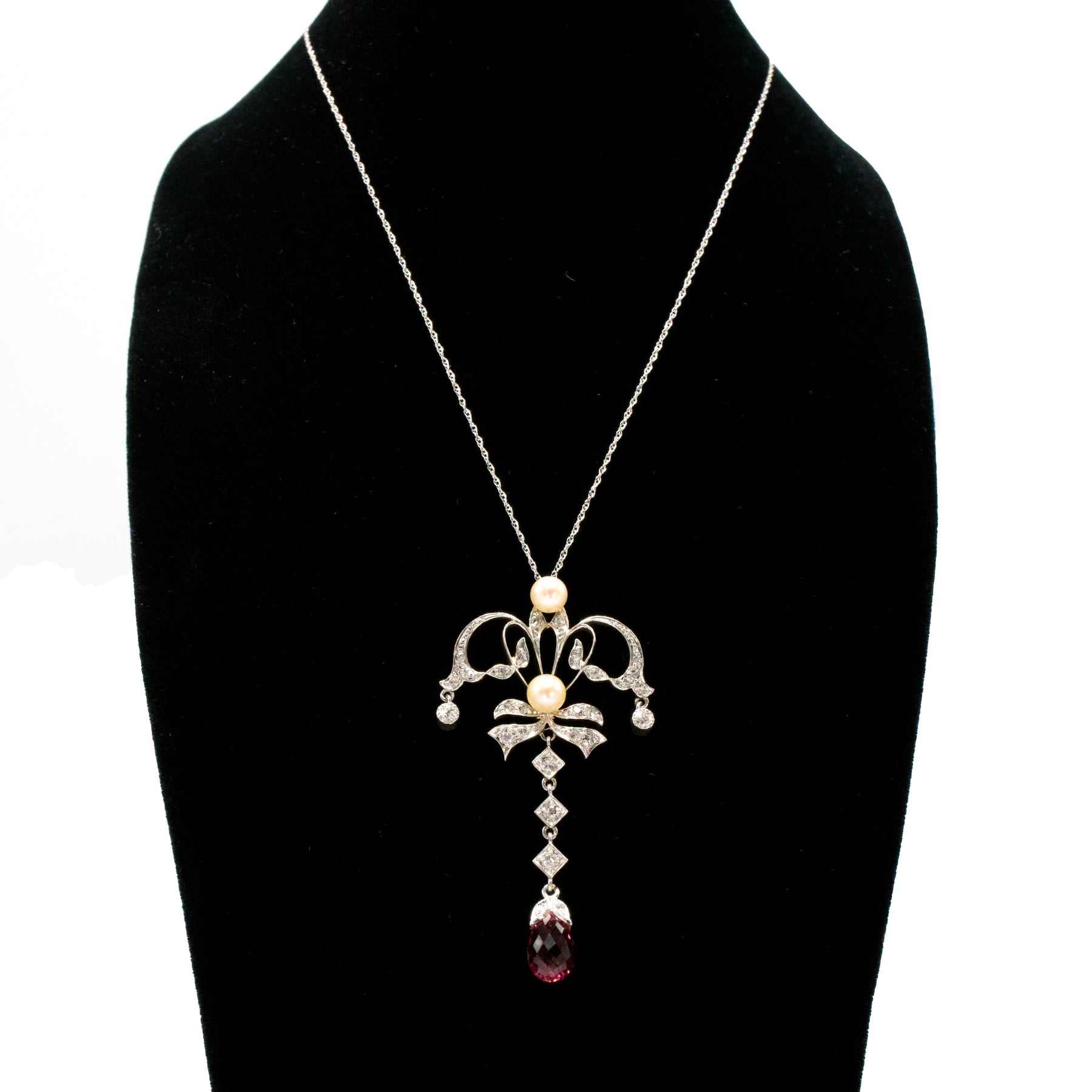 Edwardian Platinum and 14K Gold Bow Style Necklace with Rubellite
