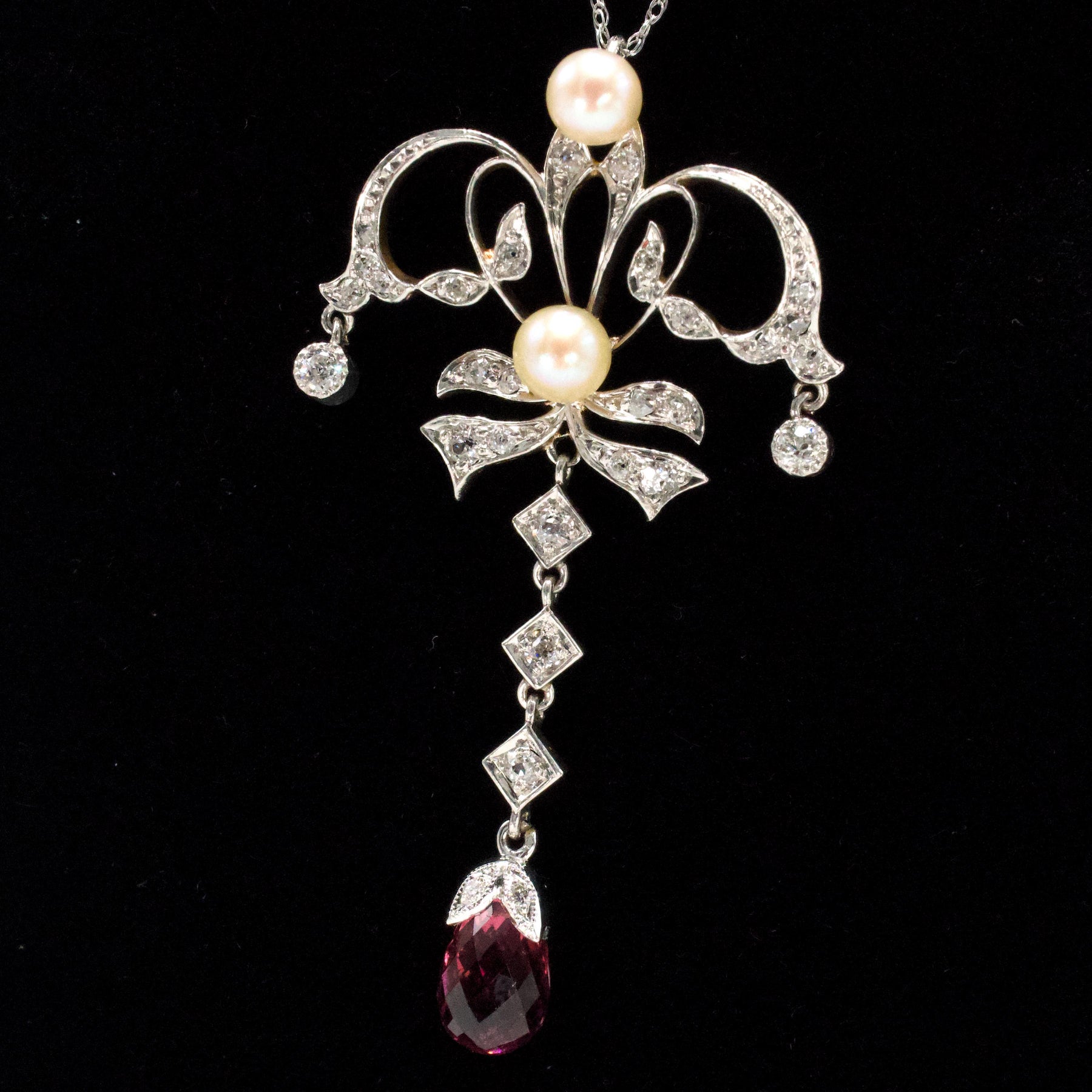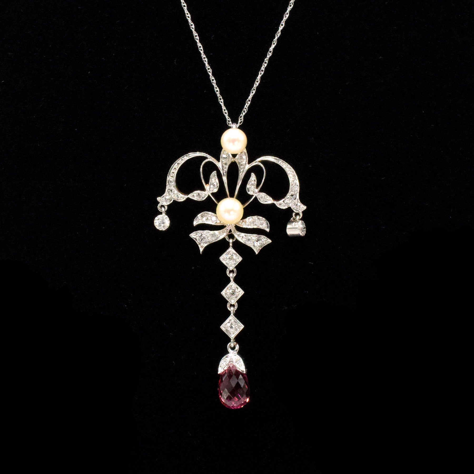 A briolette teardrop shaped rubellite pink tourmaline hangs from a line of bright set diamonds. The entire pendant is crowned by a large pearl and diamond bow.