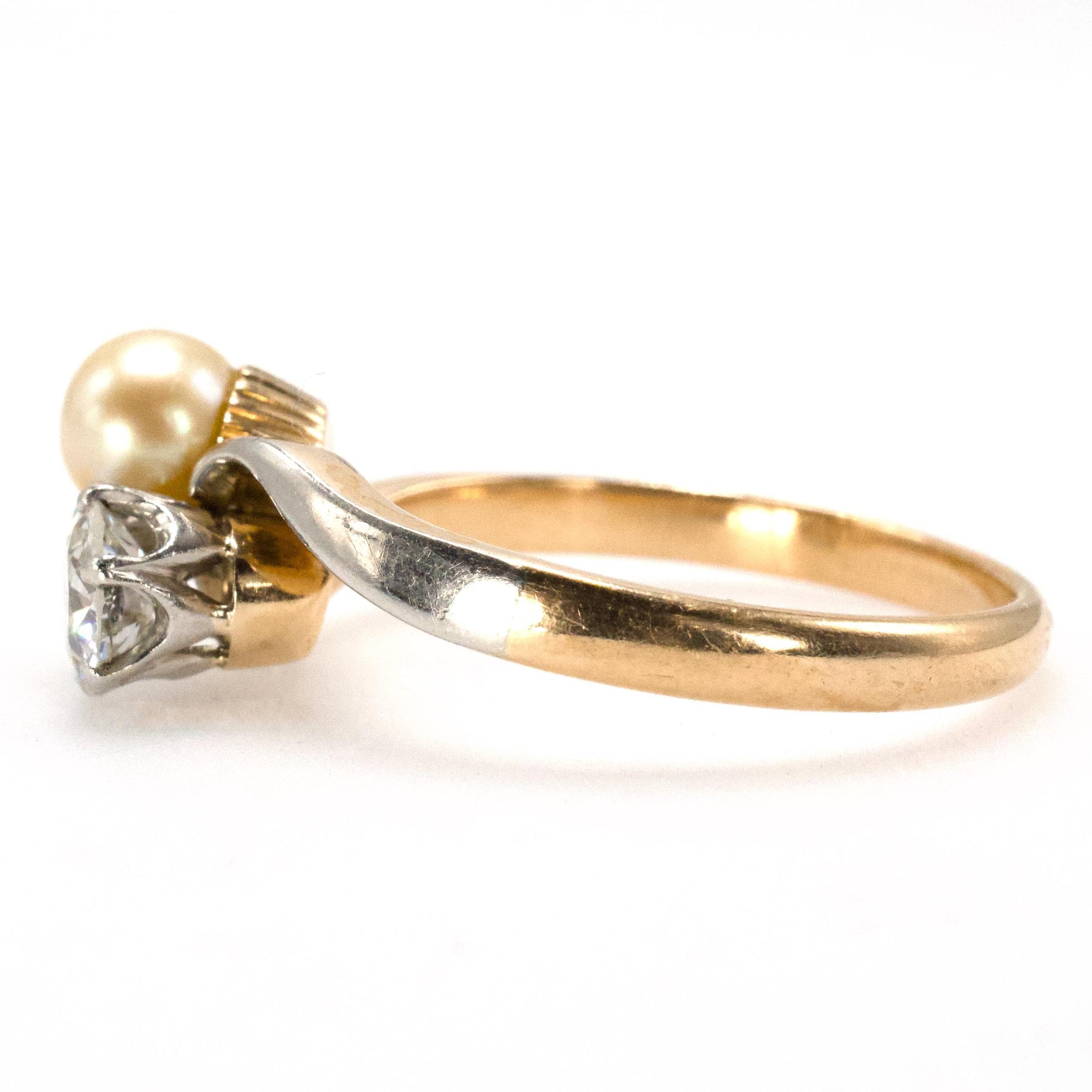 This Victorian bypass ring is made of both 18 karat yellow gold and platinum—is a perfect metaphor for duality. A warm, cream colored pearl sits next to an icy white European cut diamond: two gems, very different, are supported by two sides of a band that don't touch. Much like a marrying couple, they're distinct and separate entities united for a common purpose.