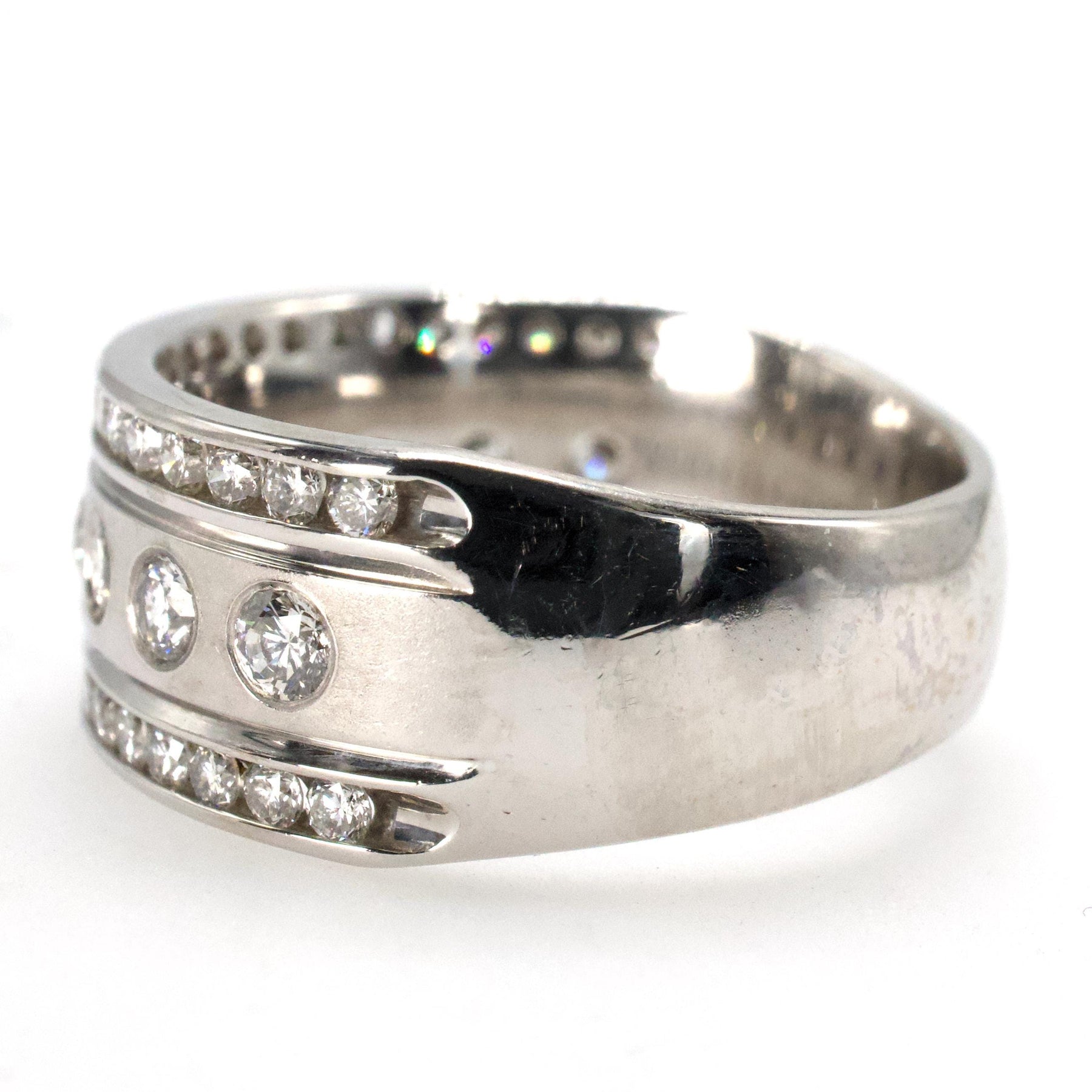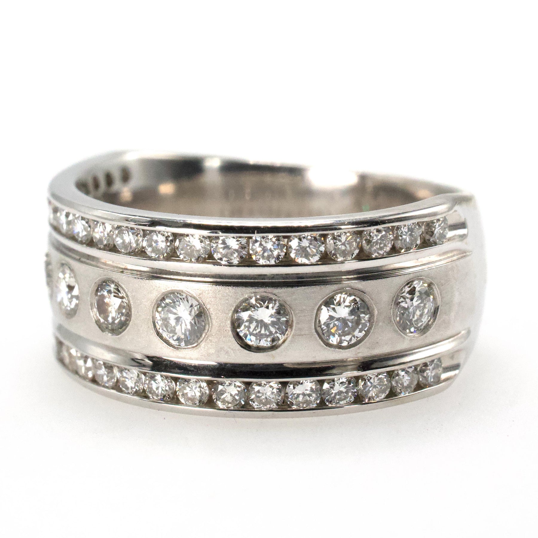 This wide statement piece is made of 14 karat white gold and sports three rows of diamonds. The central row holds 9 round brilliant diamonds (2mm each) flush set in handsome matte finished white gold. An additional 40 diamonds are set in two polished channels.