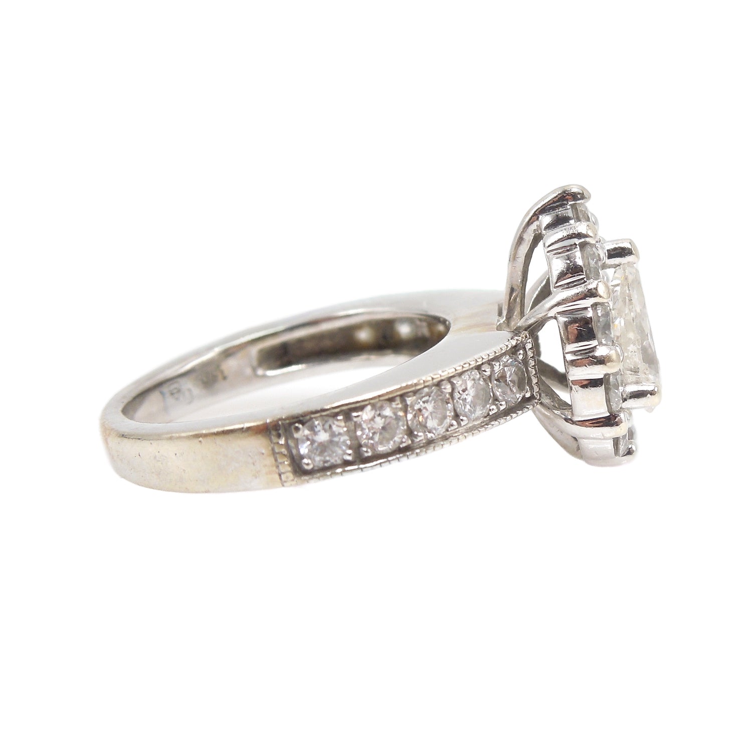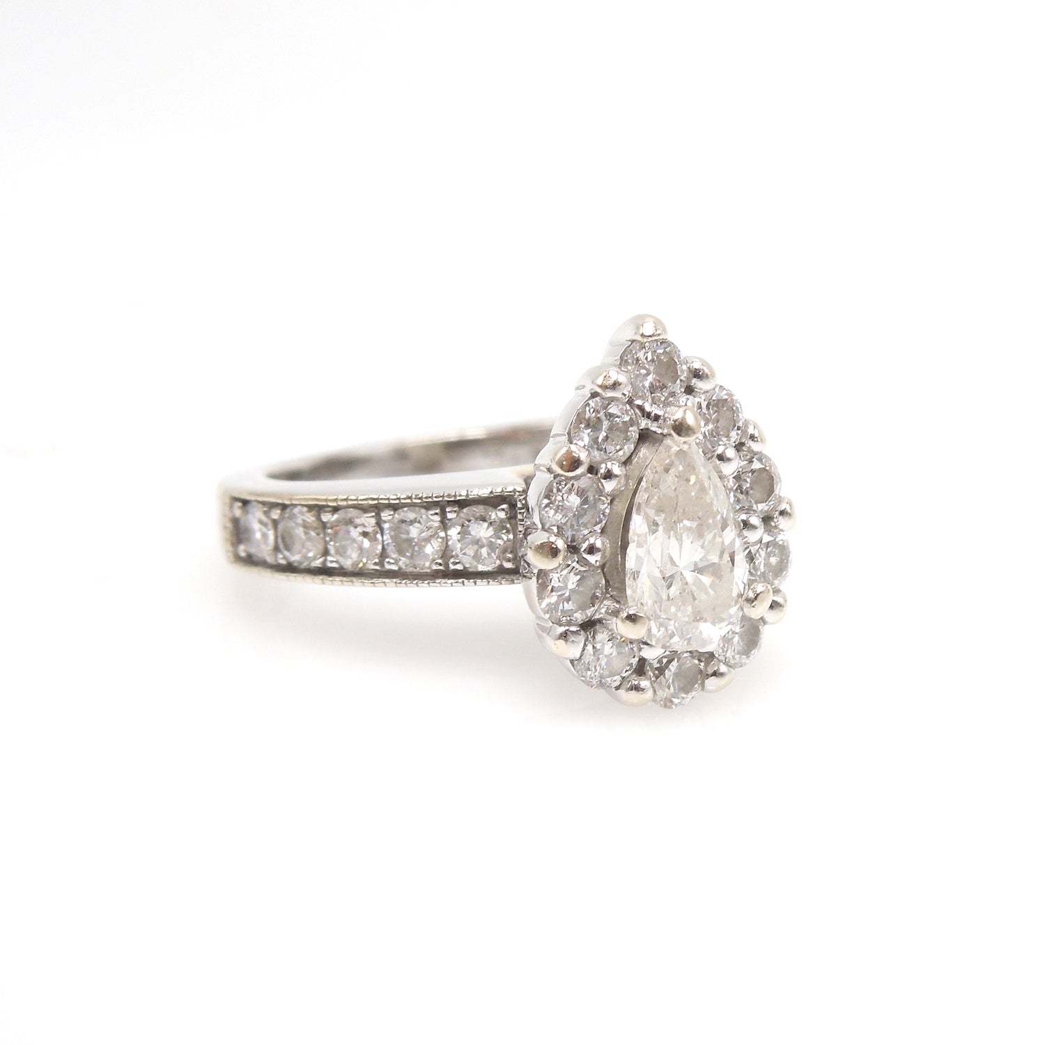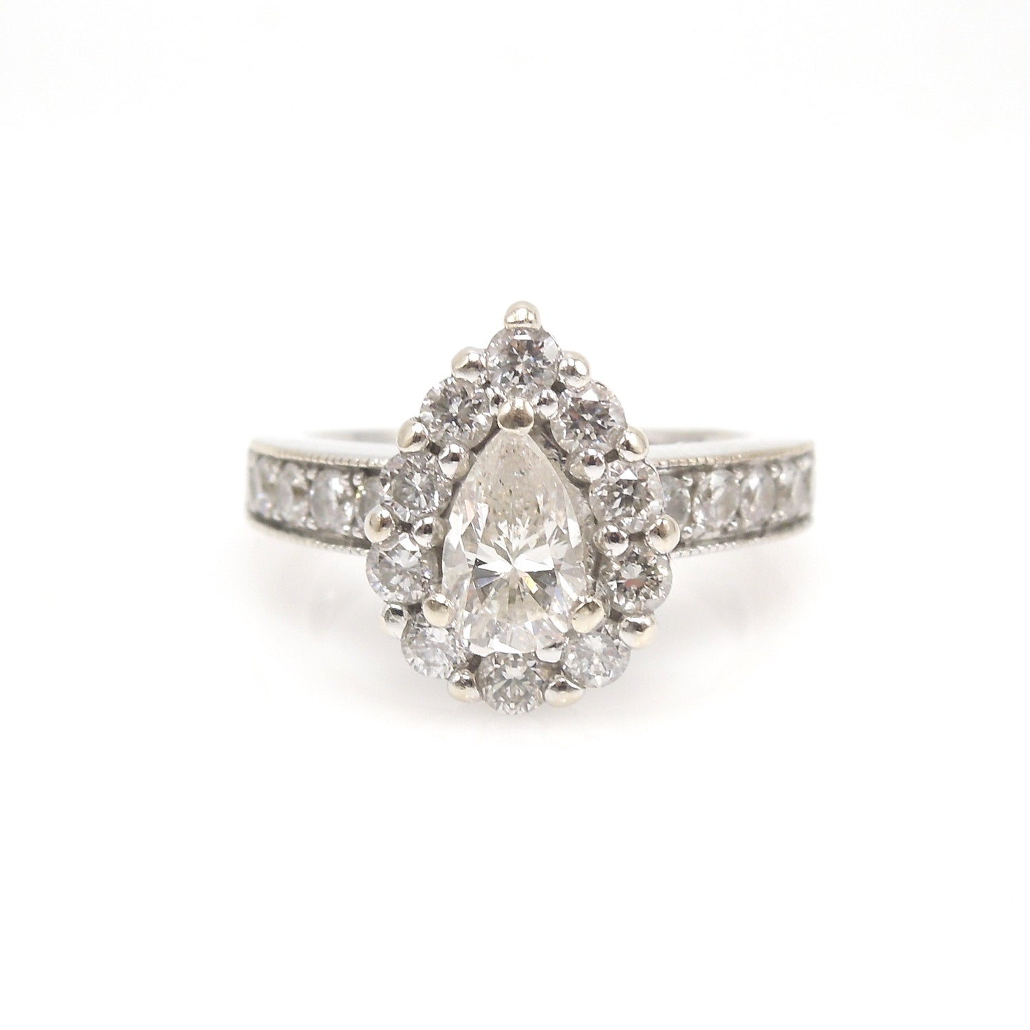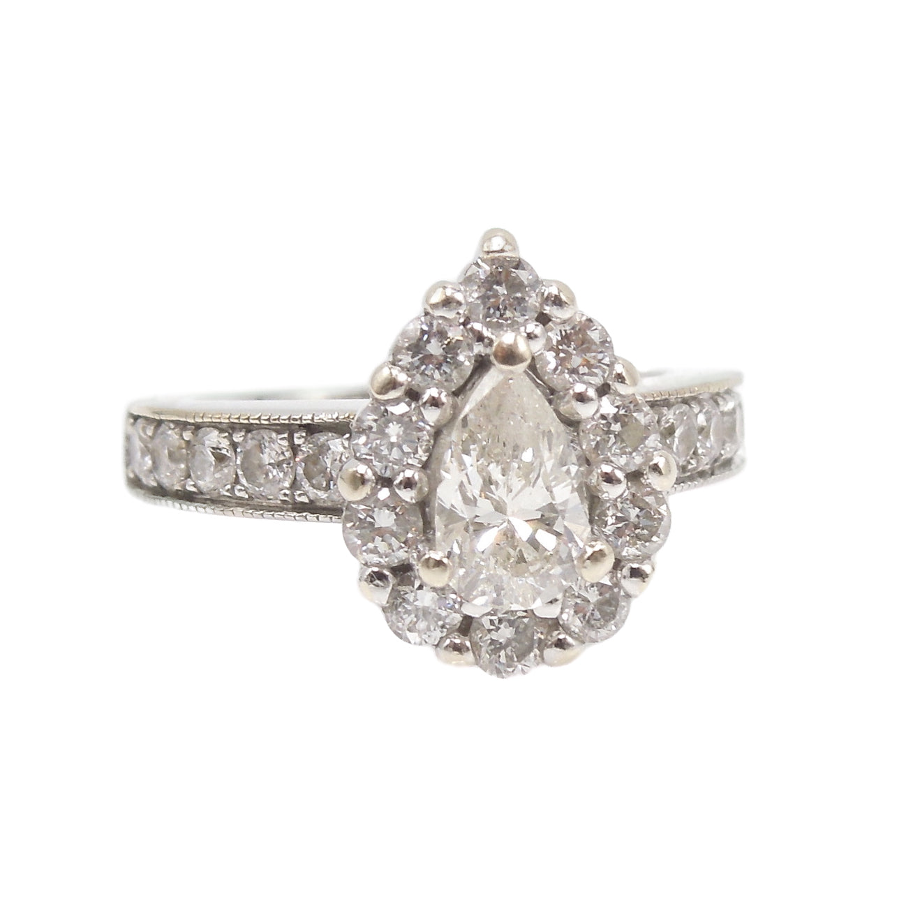 A GIA certified 0.61ct pear cut diamond is surrounded by a halo of 10 round brilliant diamonds. Made entirely of 14K white gold, this substantial mounting has an additional 10 diamonds set into its shoulders, bringing the total carat weight to 1.31ct. Looking for a ton of sparkle? Look no further.