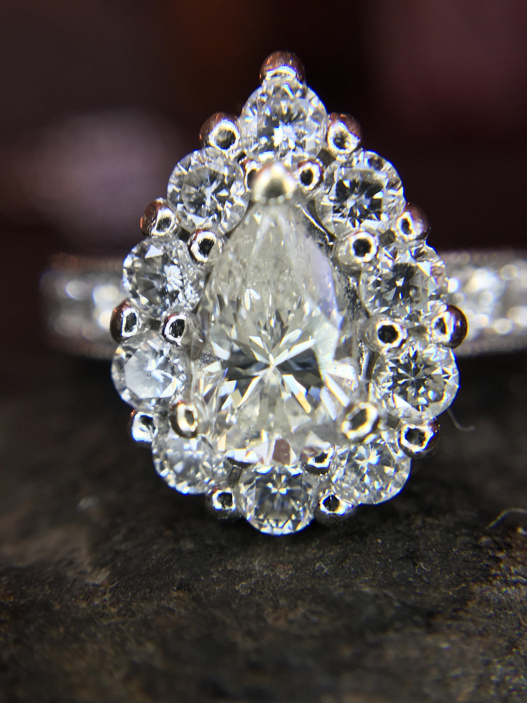 • Main Stone: 1 Pear Cut Diamond (0.61ct, J color, I1 clarity, there is a small chip near one of the prongs)
