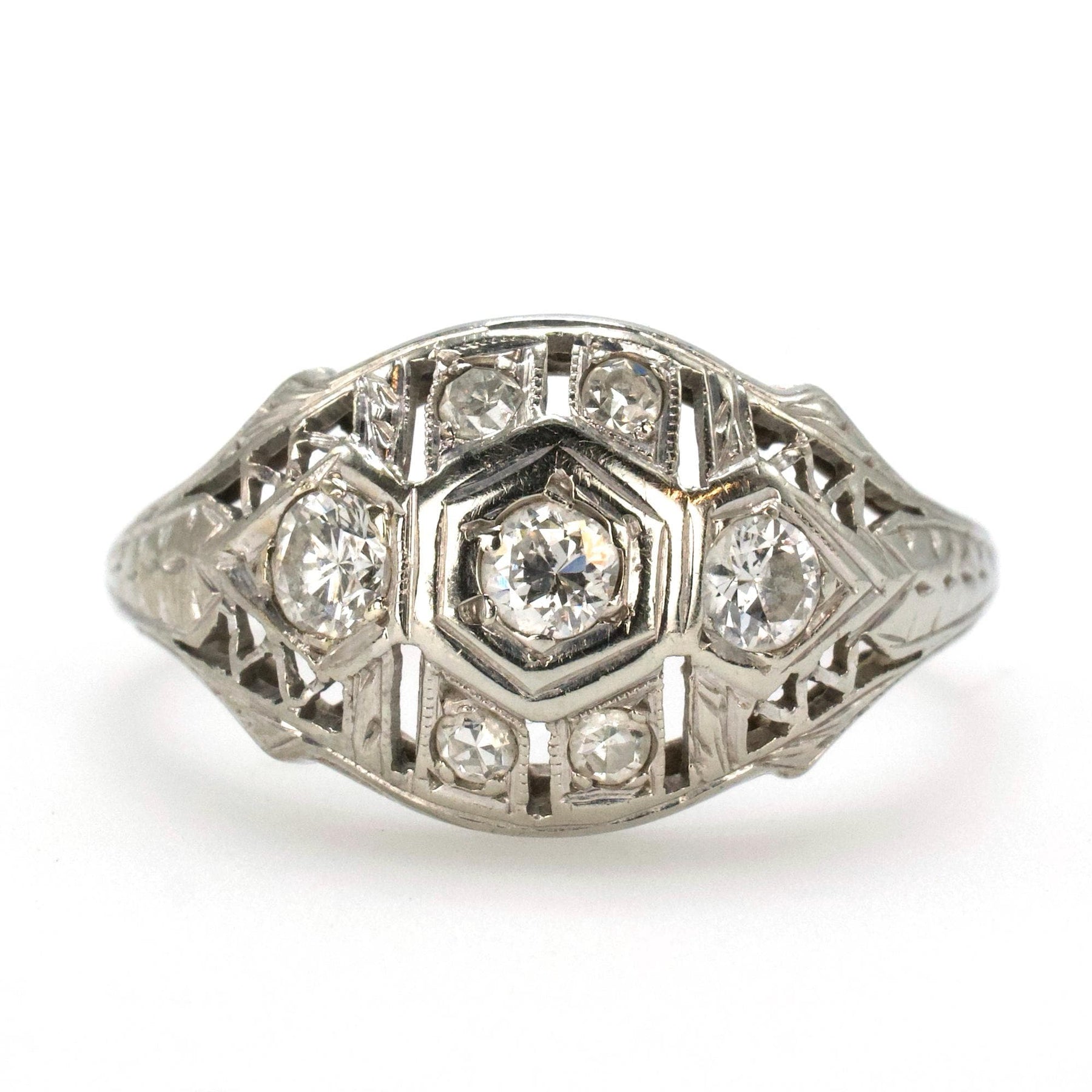 This Art Deco original ring is made of 18 karat white gold and showcases a central row of three main diamonds—the middle in a hexagonal setting and the outside pair in shield/diamond shaped settings. Two additional pairs of natural diamonds accents the top and bottom of the central stone, and the rest of the ring is embellished with negative space, dainty filigree, and crisp engraved accents.