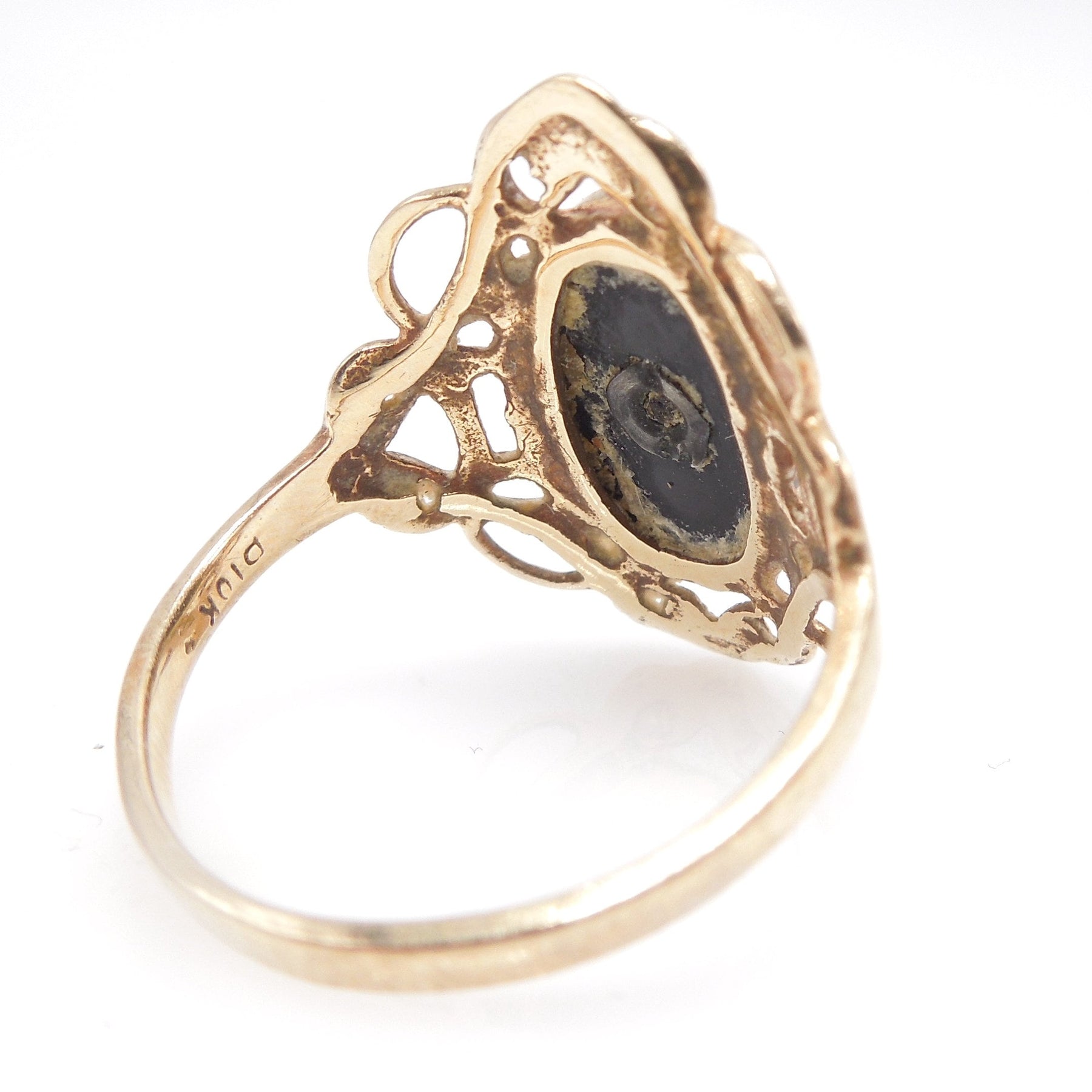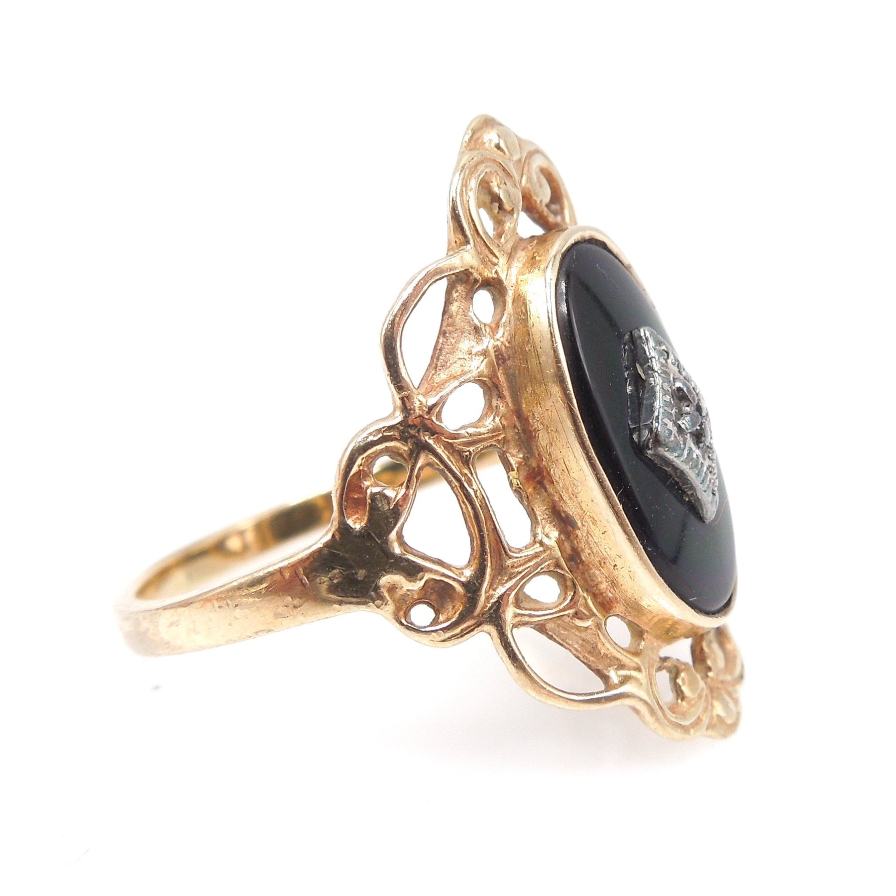 This filigreed ring, typical of the late Art Deco period (1930s), is made of 10K yellow gold and features a large, oval, cabochon onyx bezel set at its top. Set on the onyx's face is a small rose cut diamond framed in white gold.