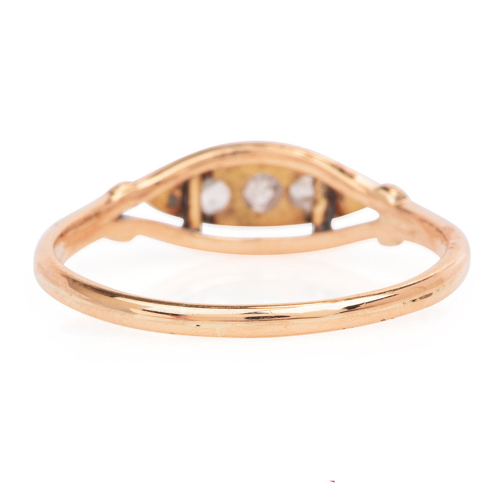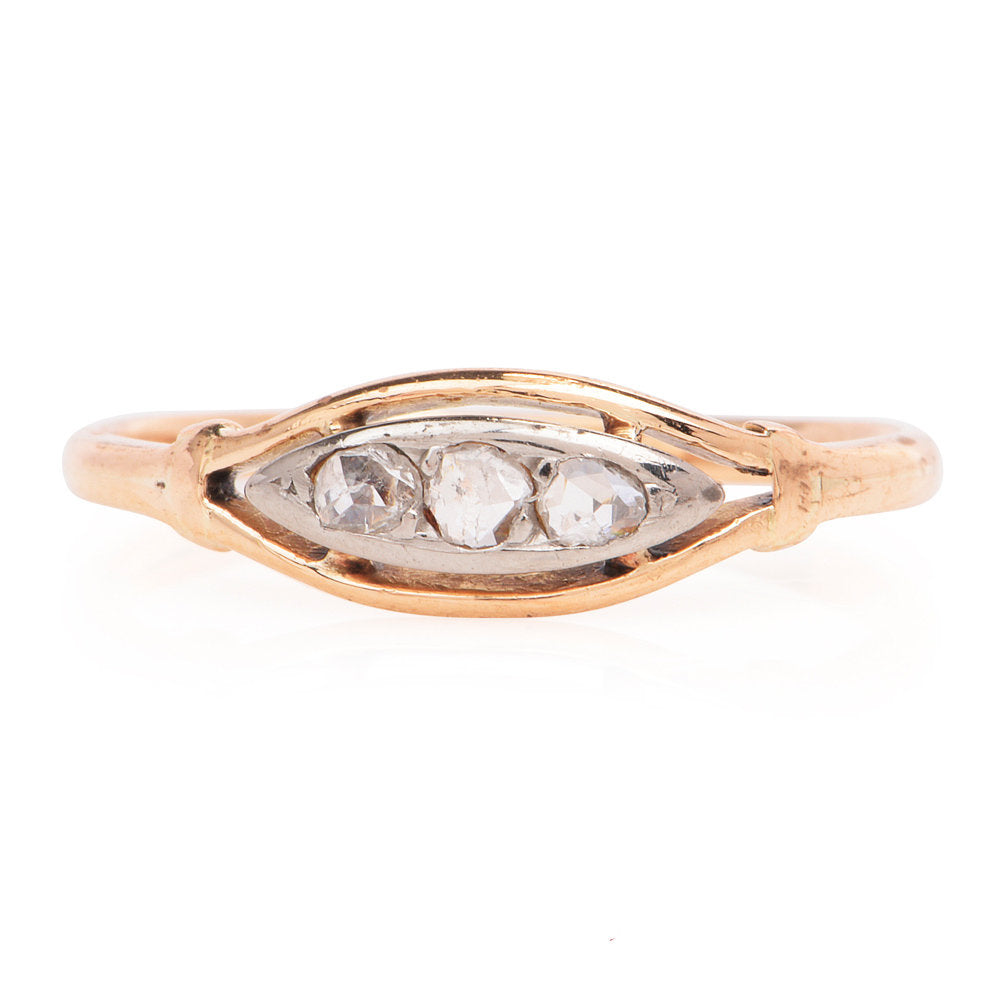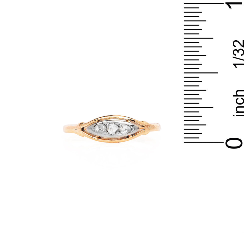 This petite ring has a bicolor gold almond shaped top. Set into the white gold center are three antique rose cut diamonds, which are separated from the rest of the ring by an airline. Both the white and yellow gold are 18 karat, and the rose cuts weigh a collective 0.03ct total.