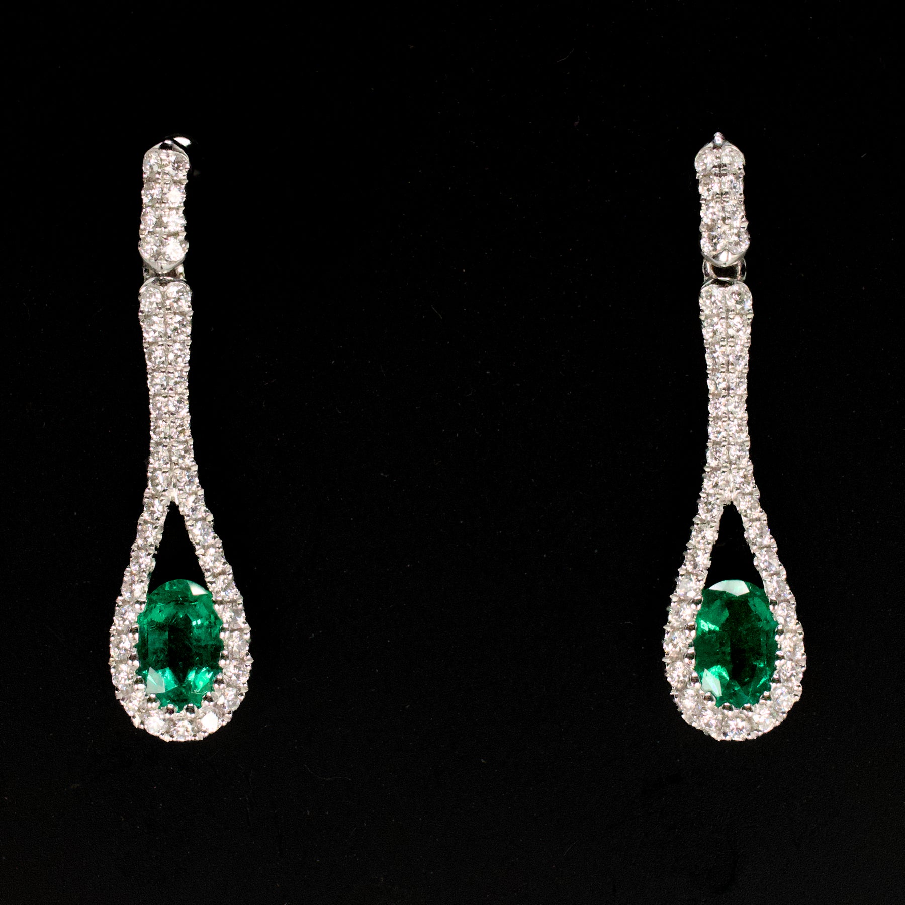 This stunning pair of drop earrings holds two fine oval cut emeralds nestled in a white gold and diamond loop. A perfect pair of occasional earrings, they measure 1" long and fasten to the ear with a push back.