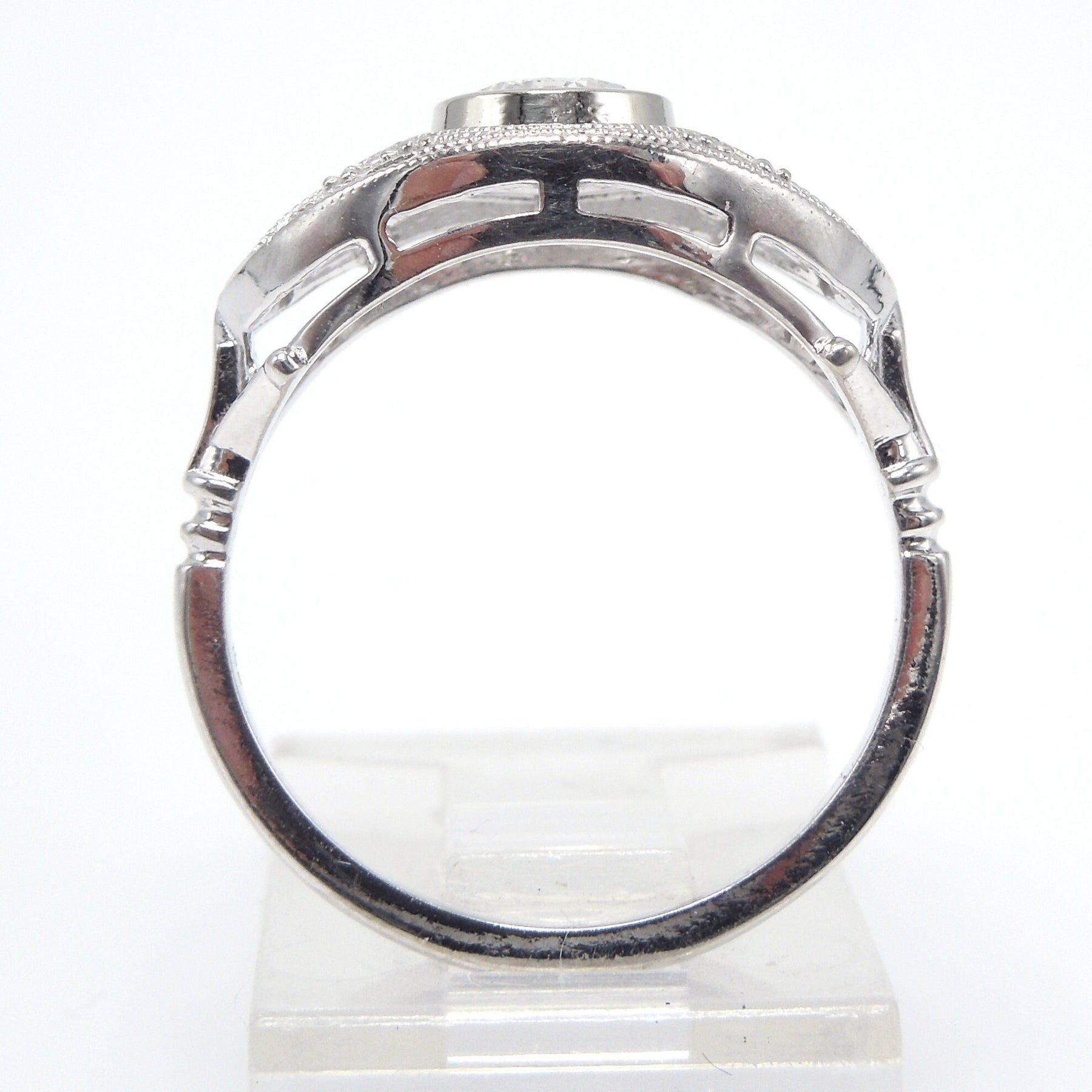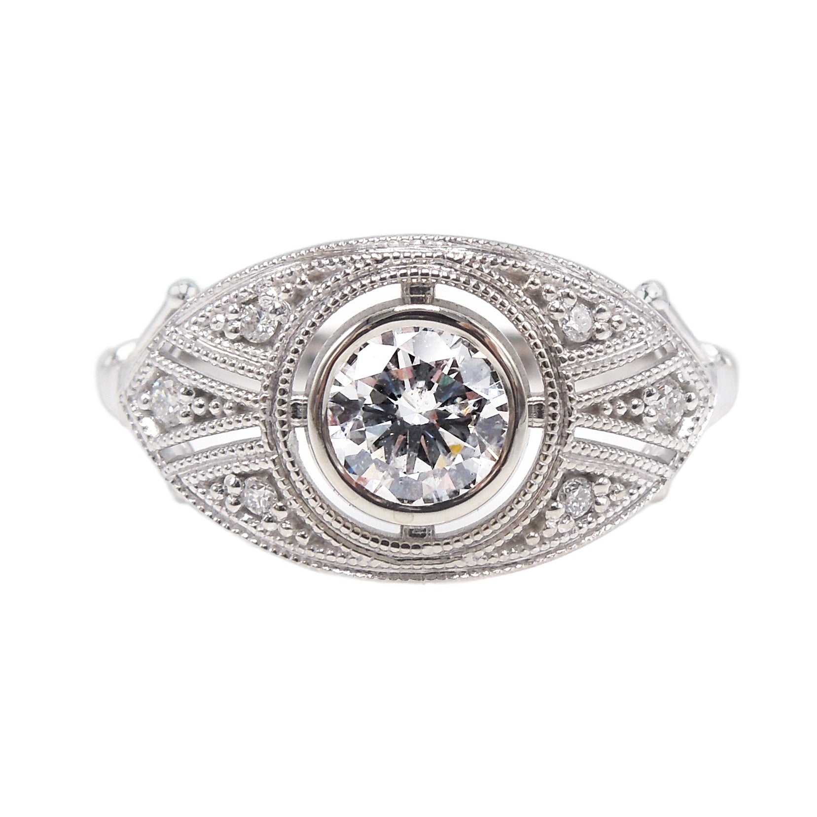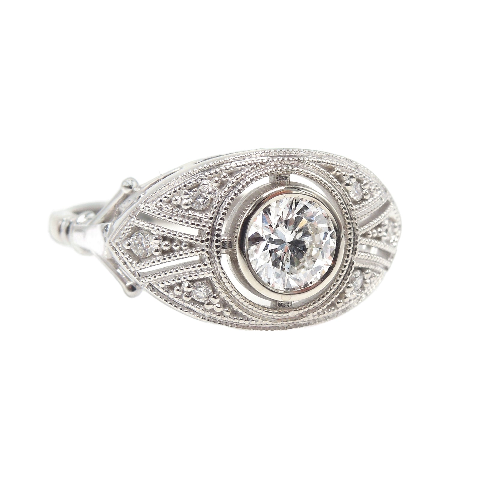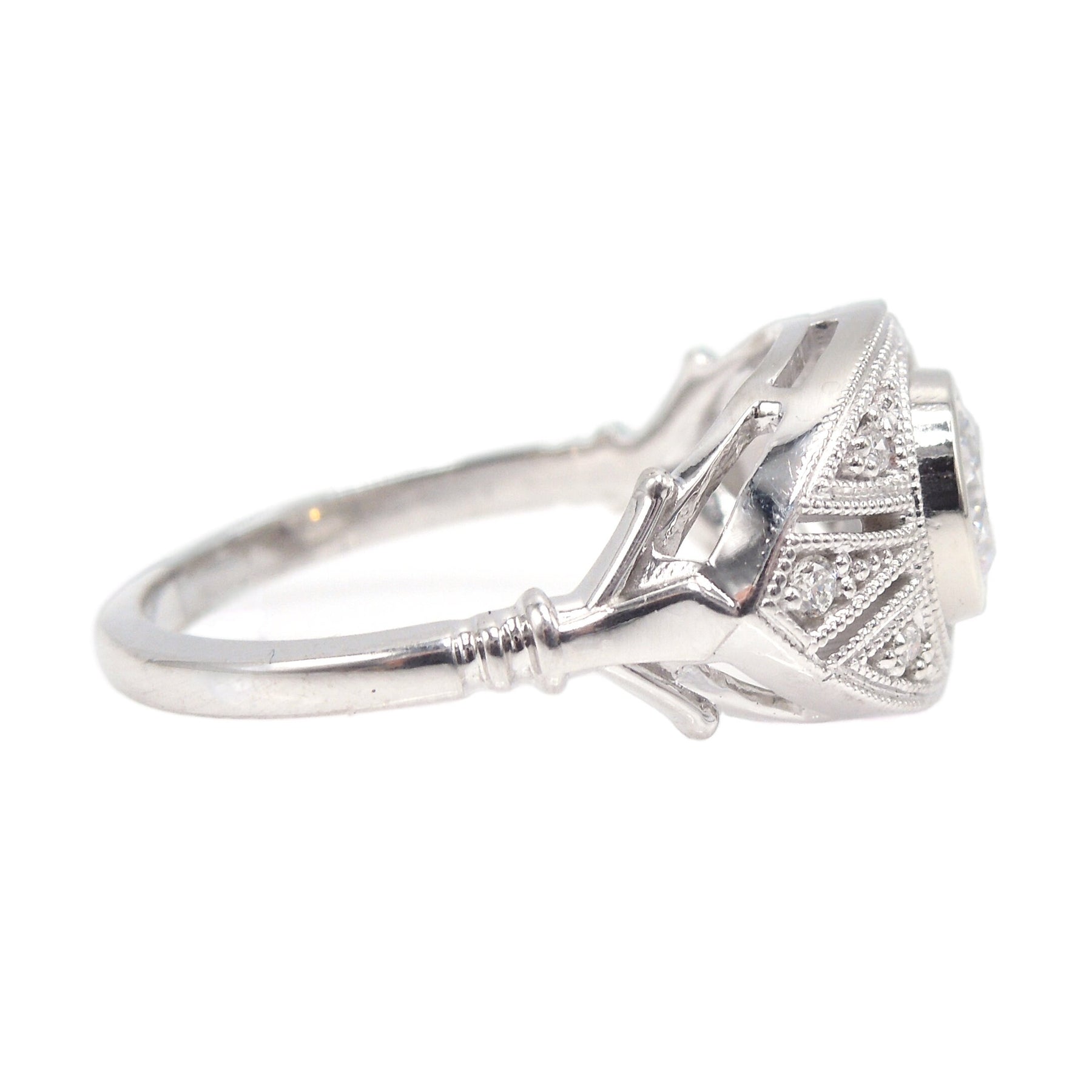This almond shaped Art Deco style mounting has it all. Replete with accent diamonds and delicate cutouts, the central diamond is bezel set and separated from the rest of the mount by an airline of negative space.
