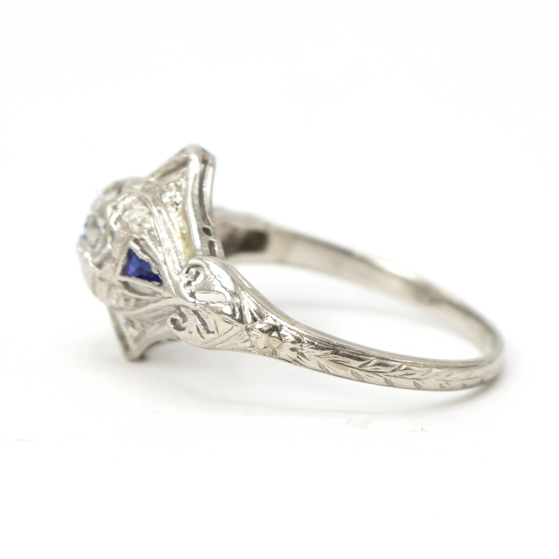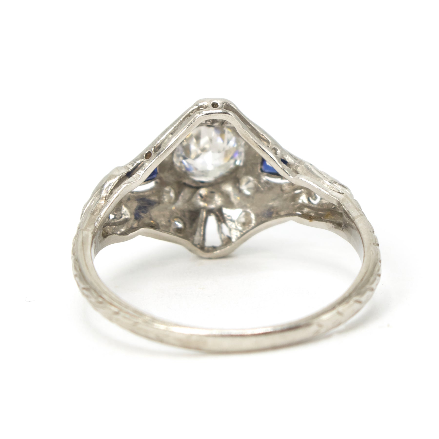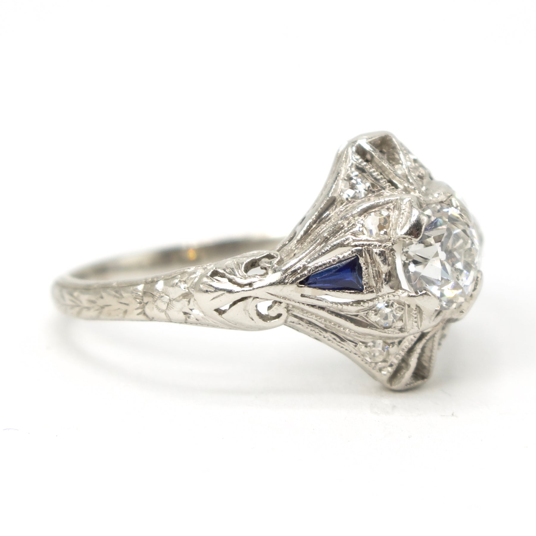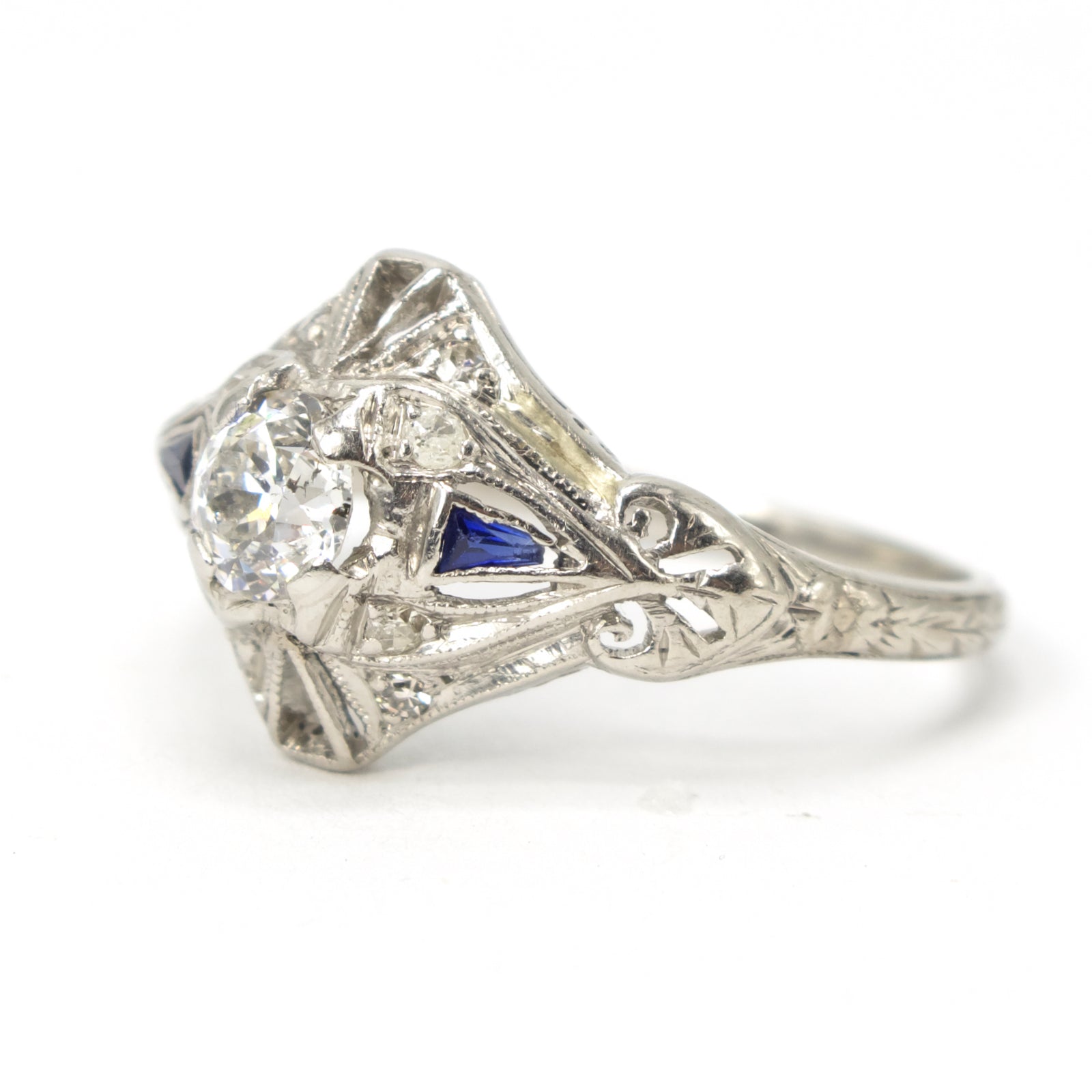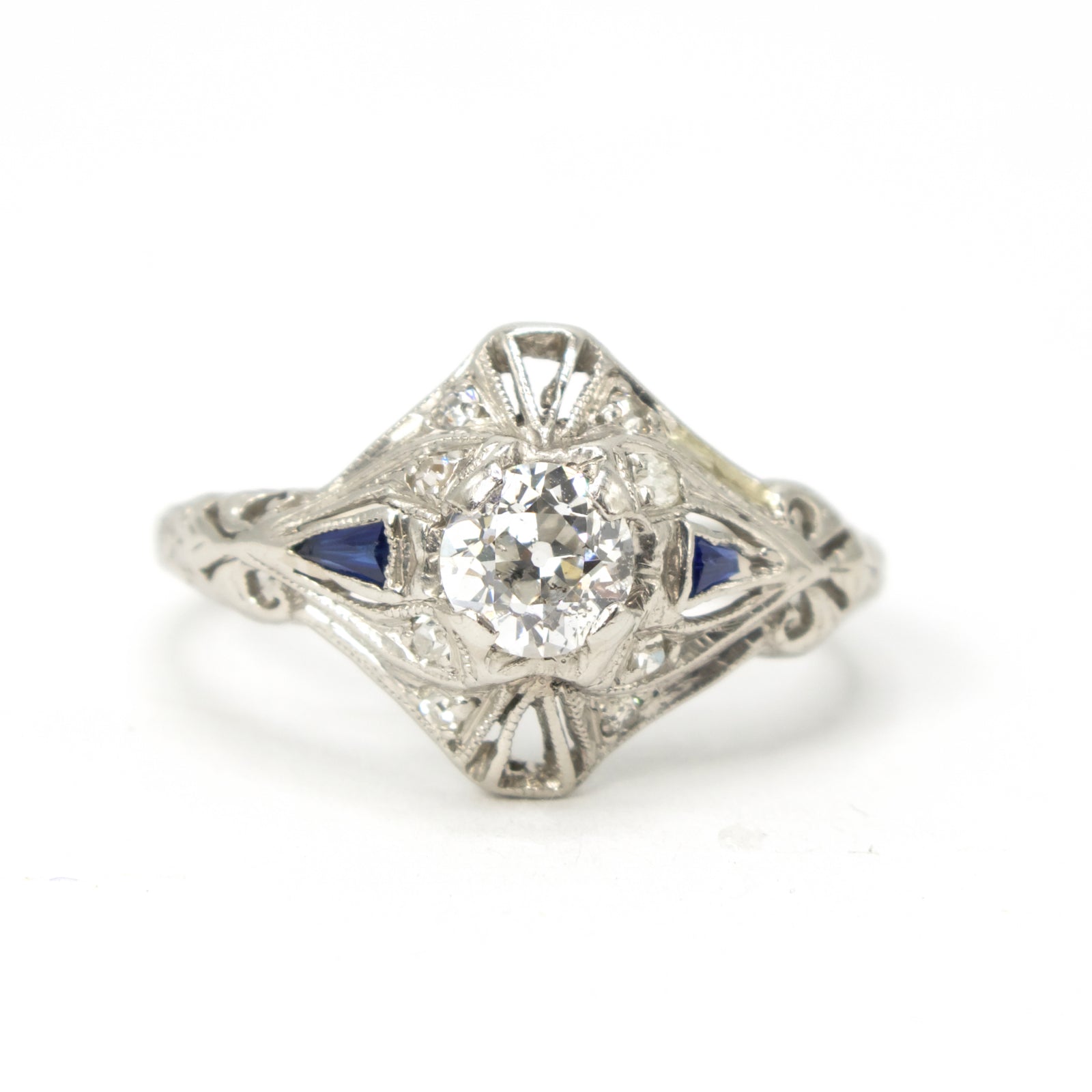 This antique diamond ring, a product of the 1920s, is made of platinum and has a central European Cut diamond weighing approximately 0.40 carat. Two triangle sapphires accent the main stone on its left and right sides with cutouts for additional stones at the top and bottom.