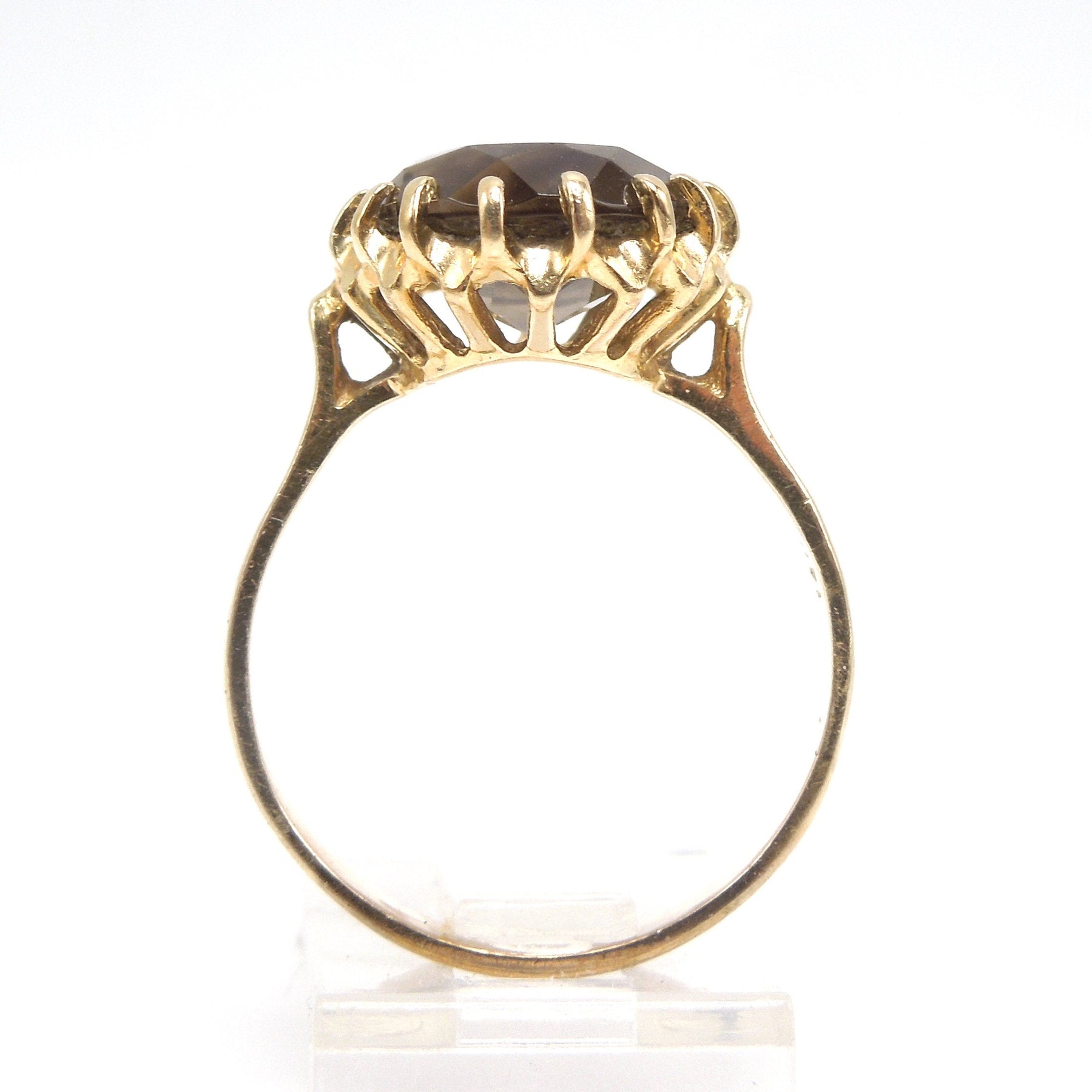 Weighing in at approximately 5.00ct, a transparent, brown quartz is held in place with sixteen prongs. The ring itself is made of 14K yellow gold and the contrast between the rich gold and the deep brown is very attractive.