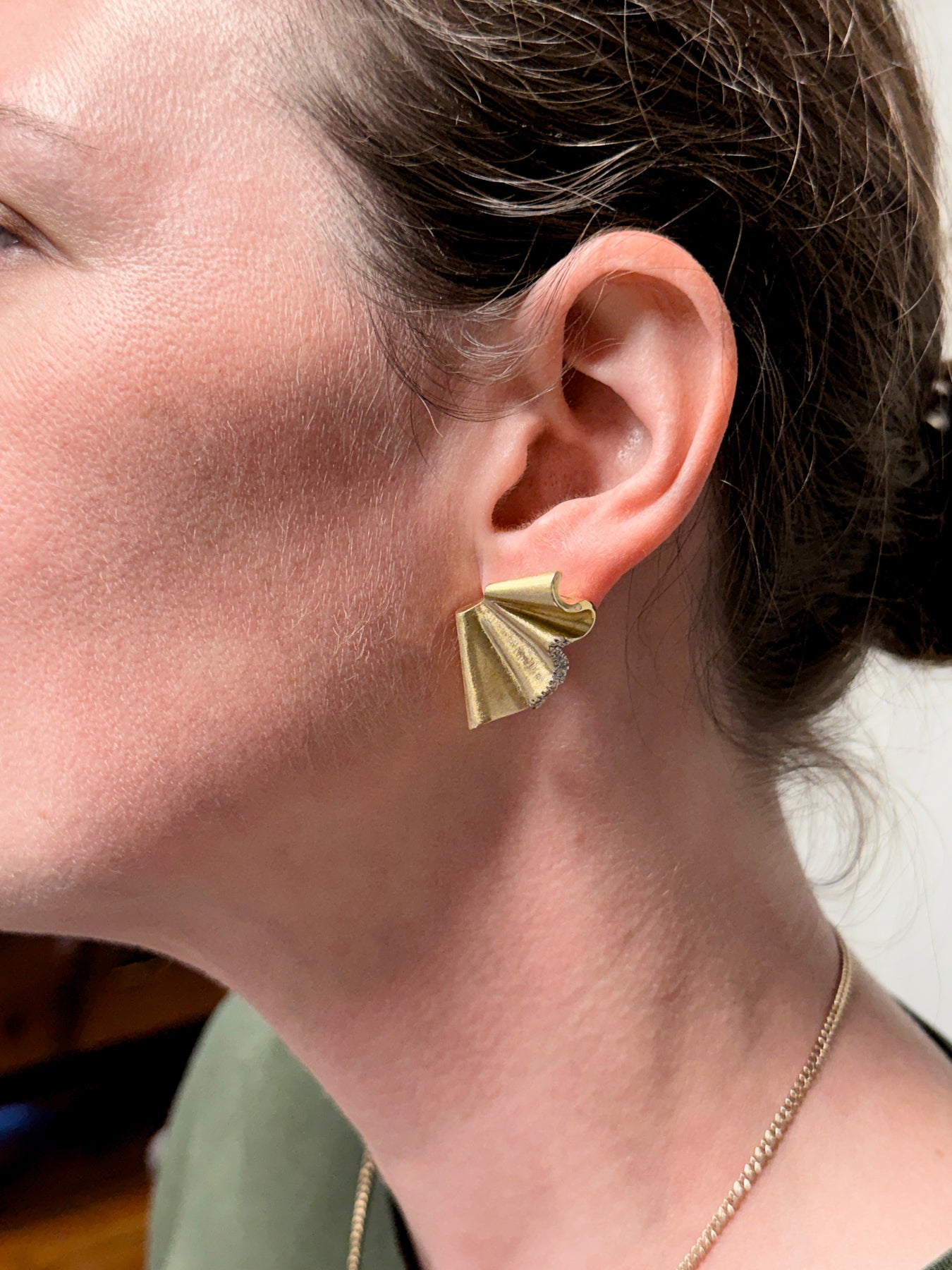 We are obsessed with these earrings. Made of 14 karat yellow gold and handcrafted in Italy, they're made vaguely in the style of a folded paper fan. Each has a small trim of diamonds on the outside and they secure to the ear with a study omega back.