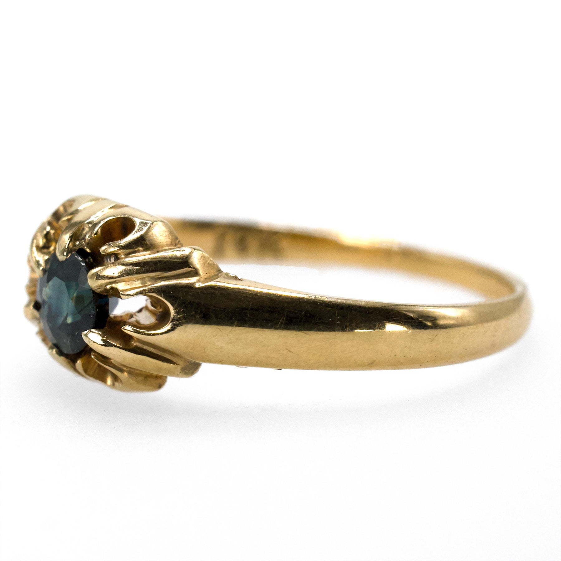 This sweet Victorian-era solitaire is made of 14 karat yellow gold and features a dark natural round cut sapphire that's held in place by dainty little prongs. Lovers of small rings will be absolutely charmed by this antique ring and, as an added bonus, it absolutely qualifies as the "something blue" at a wedding!