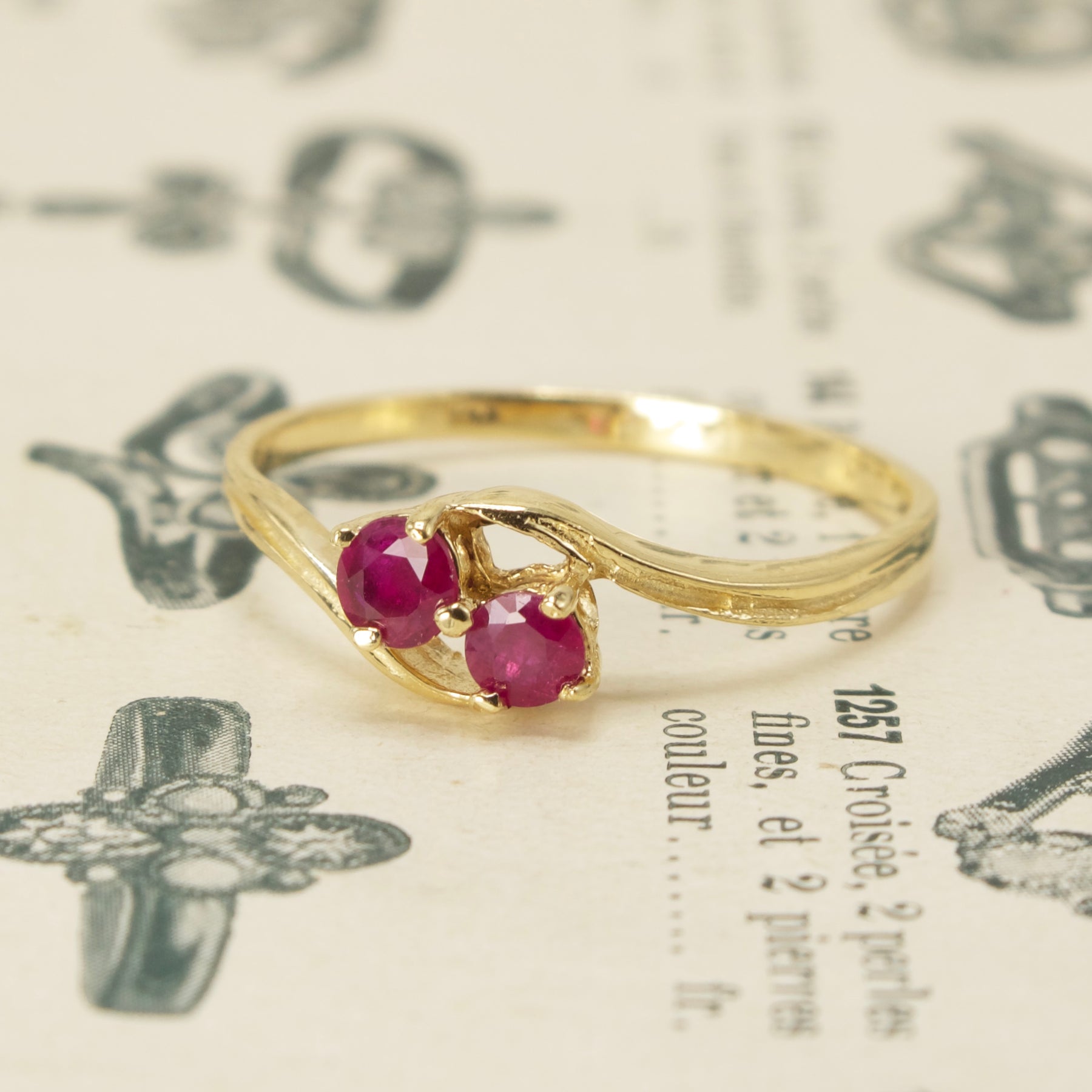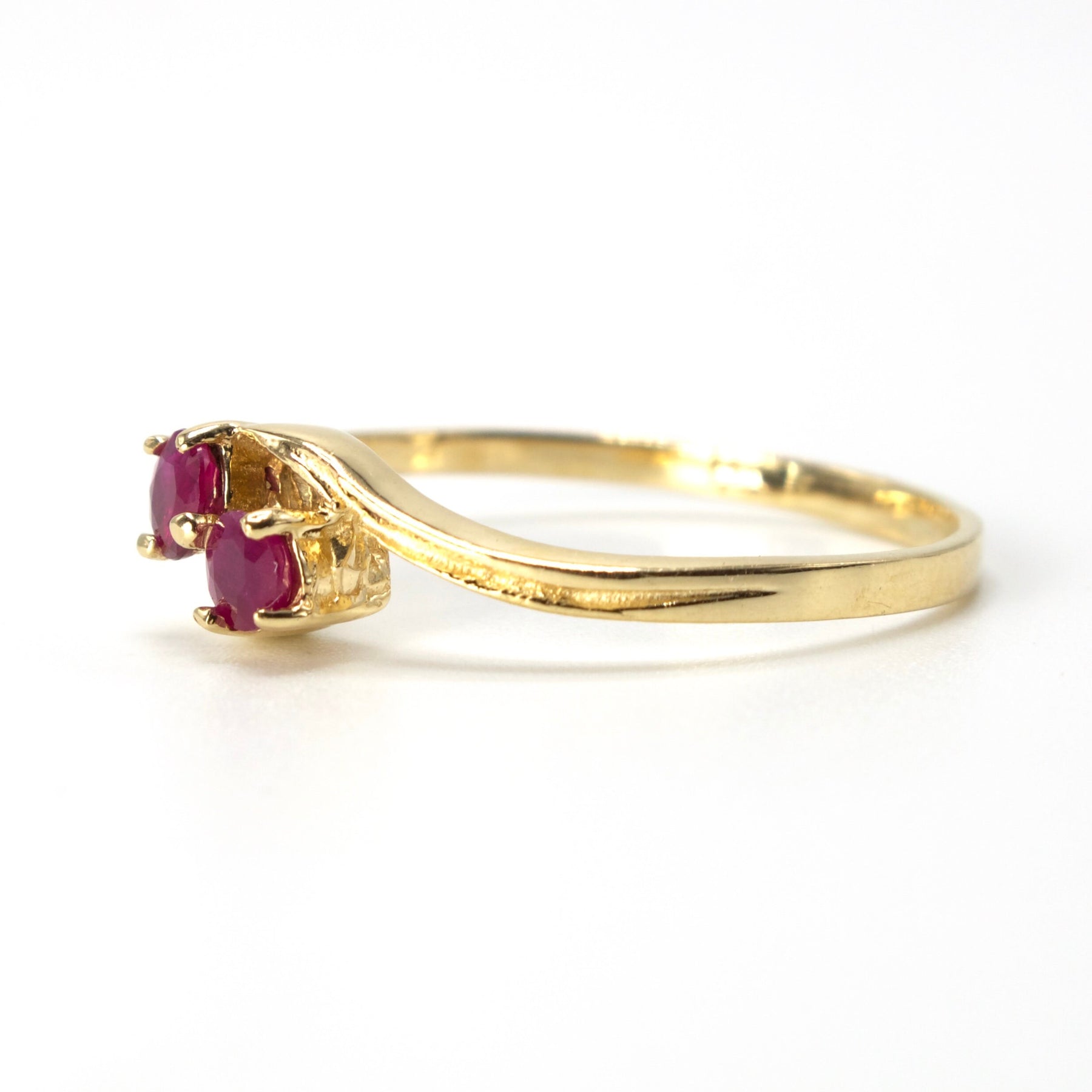 This vintage bypass ring, a two-stone piece that's perfect either for stacking or as a dainty and non-traditional engagement ring, has two natural rubies prong set at its center.