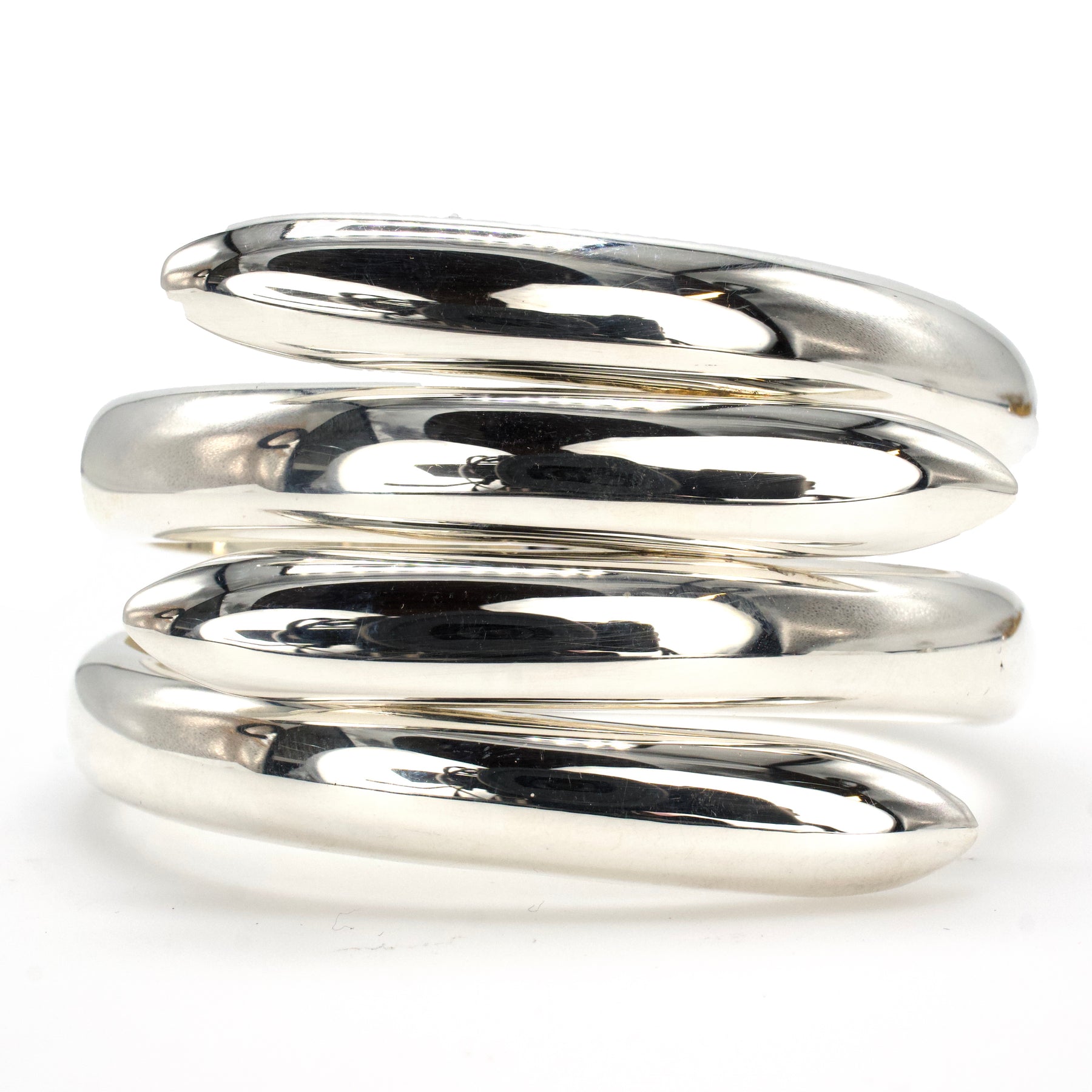 We fell hard for this fabulous bracelet when we first saw it! Made in Taxco, Mexico, this oversized sterling silver cuff is hinged and, when closed, looks like two pairs of interlocking tines grabbing the wrist.