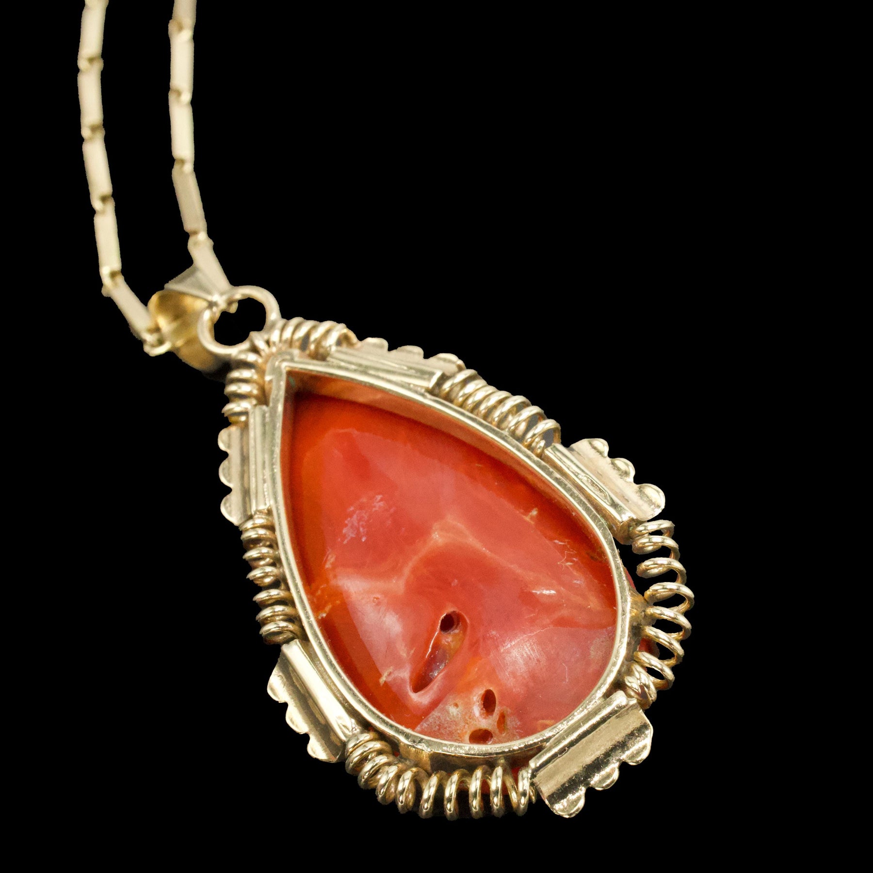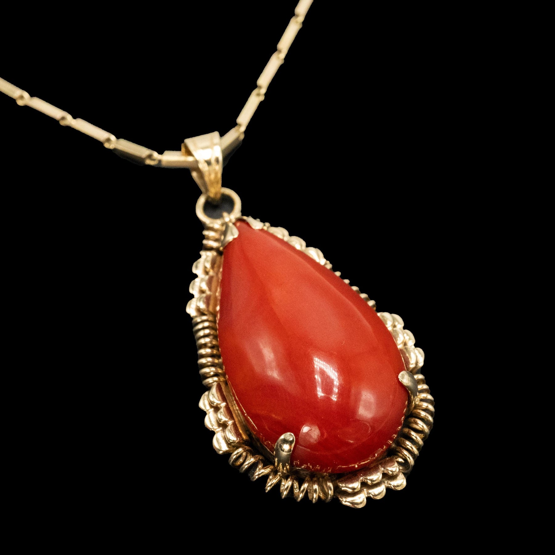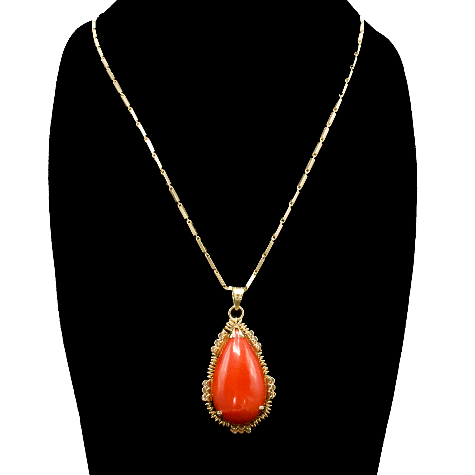 A large teardrop shaped piece of natural red coral is set in an attractive 14 karat yellow gold prong style pendant setting with a wire wrap surround and bail. The pendant is suspended from a 21-inch bar style chain, also made of 14 karat yellow gold, with a gold fill spring ring clasp.