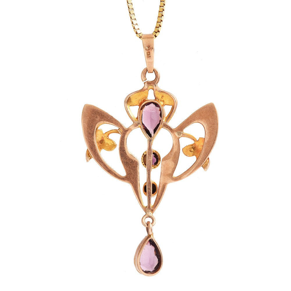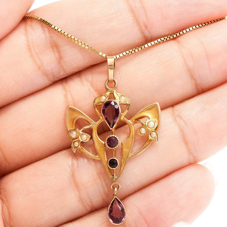 This Art Nouveau style yellow gold pendant holds two pear shaped amethysts, two round amethysts, and is beautifully accented with natural seed pearls. Art Nouveau jewelry is renown for its smooth, sensuous lines and the aesthetic emphasis it places on nature.