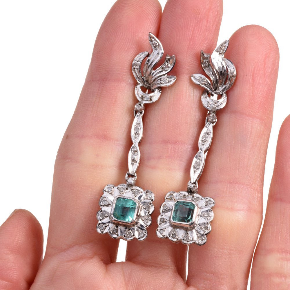 Vintage Emerald and Diamond Drop Earrings in Palladium