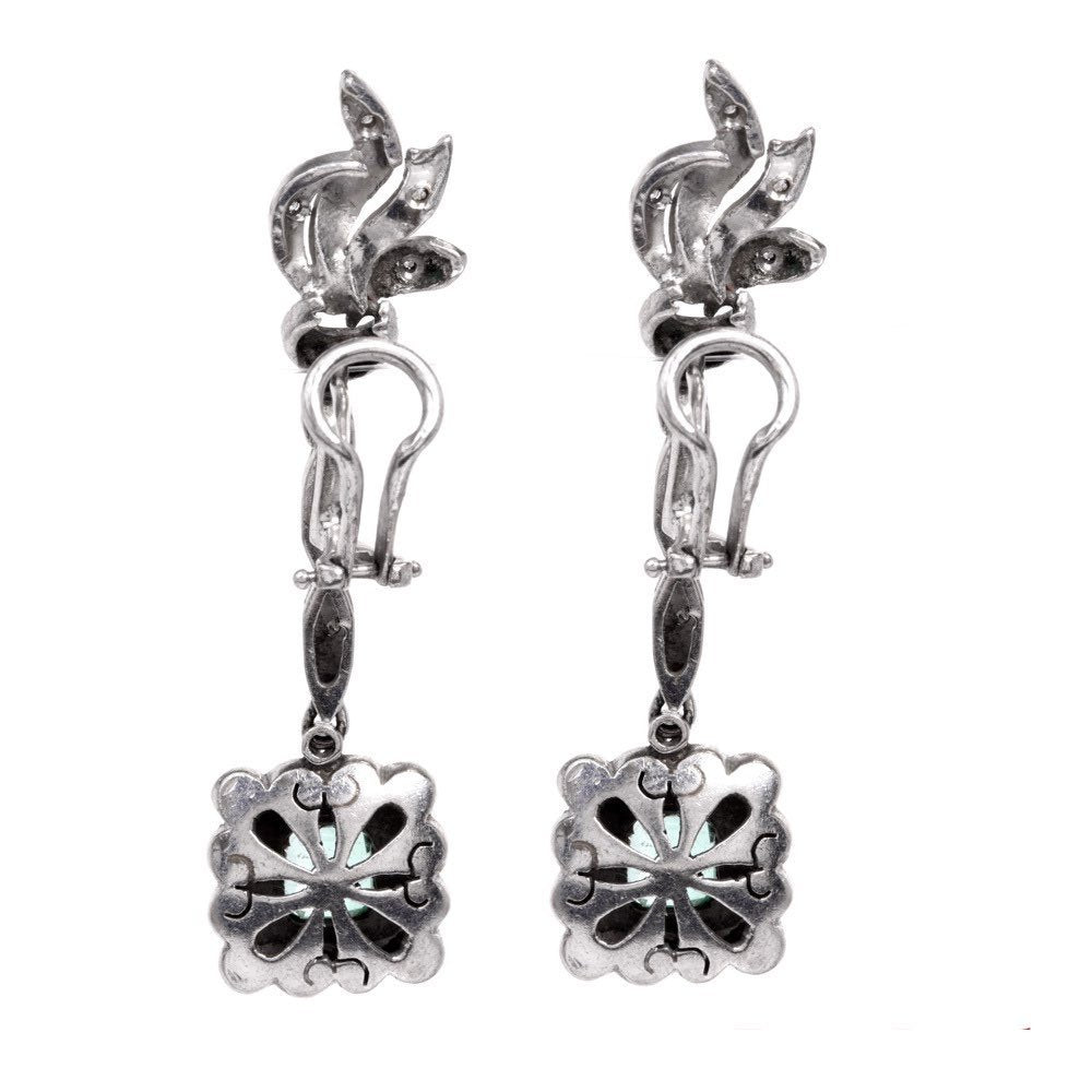 These lovely drop earrings are made of palladium, which would date them to about the 1940s. Each has an approximate 0.60ct emerald cut emerald at its bottom, surrounded by flourishes of palladium peppered and 42 round brilliant diamonds.