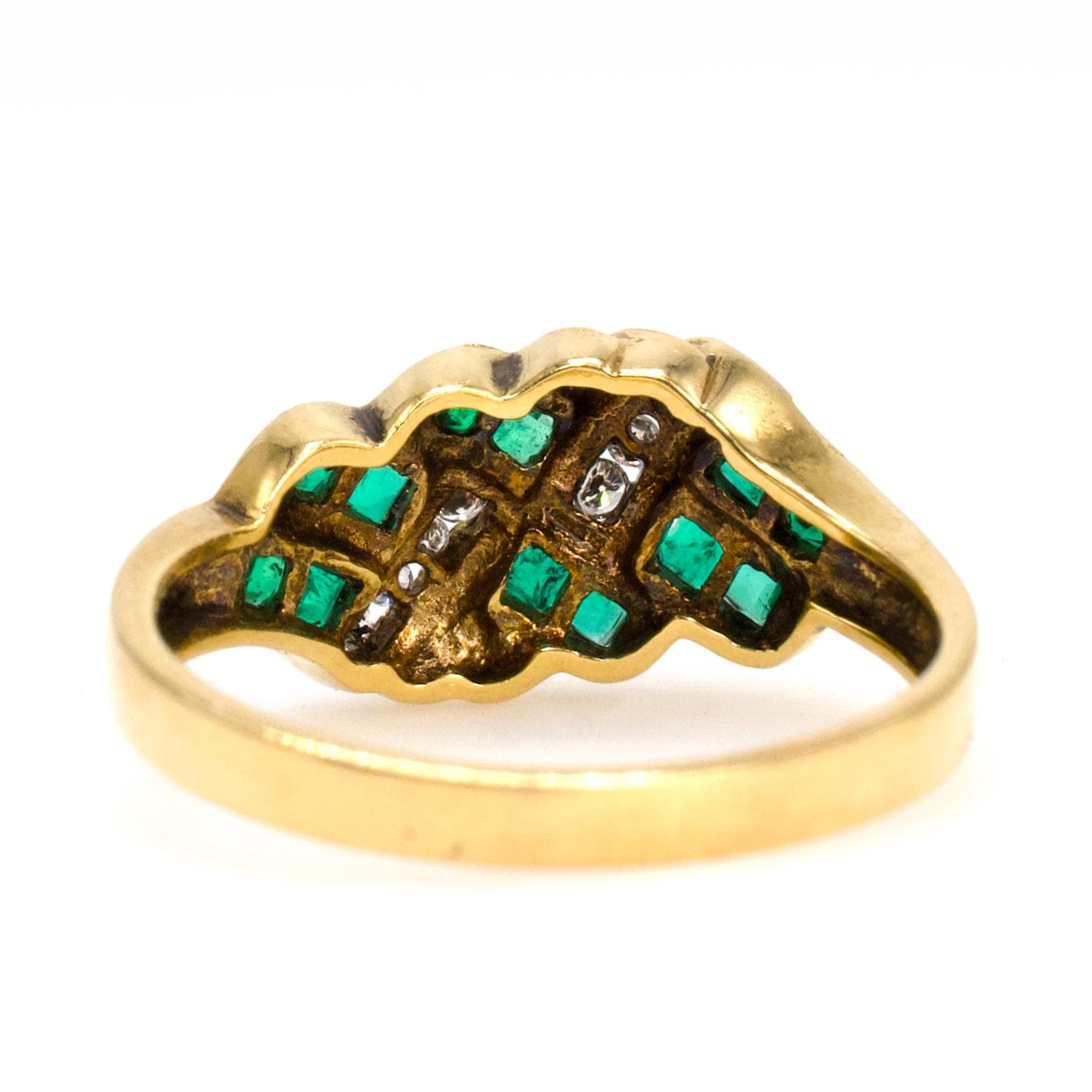 Made of 18 karat yellow gold, this lovely wide band (it measures approx. 8.5 mm across!) holds ten diamonds and twelve square cut natural emeralds. The dazzling white of the diamonds and the rich, bright green of the emeralds beautifully shine against the high karat surrounding gold.